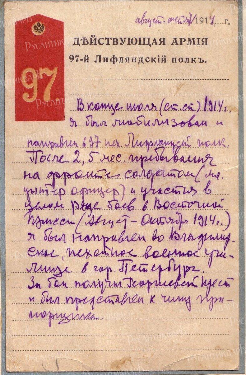 С февраля 1917 г. – командир роты в 291-м пехотном запасном полку (г. Ярославль). Последнее звание в РИА - штабс-капитан.