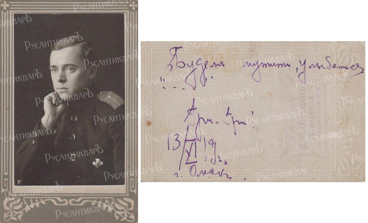 Тот самый юнкер,который в мае 1909 года при посещении училища главным начальником Военно-учебных заведений Великим Князем Константином Константиновичем,набрался храбрости предложил Великому Князю обменяться темляками. Родился 20 августа 1888 года в Усть-Каменогорске в семье канцелярского служащего. Окончил Усть-каменогорское городское трёхклассное училище. С 1906 по 1909 год обучался в Иркутском пехотном юнкерском училище. В 1913 году поступил на китайское отделение Института восточных языков во Владивостоке. В 1914 году был отправлен в командировку в Пекин для изучения языка. В июле 1914 года командировка была прервана мобилизацией. 11 сентября 1914 года выбыл на Западный фронт.