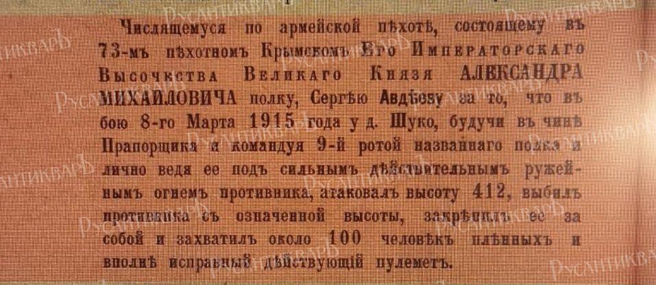 Георгиевские Кавалеры Училища. А вот выпускнику Чугуевского училища, офицеру 73-го пехотного Крымского полка Сергею Павловичу Авдееву в эту войну досталось самое парадоксальное награждение за всю историю ордена Св. Георгия. По закону нельзя было получить один и тот же орден два раза. Если офицер совершил подвиг, но уже имел орден Святого Георгия 4-й степени, то его представляли либо к Георгиевскому оружию, либо к ордену 3-й степени. Однако Сергей Павлович Авдеев, уроженец г. Павлограда Харьковской губернии, стал исключением, получив в период Первой мировой войны два ордена Святого Георгия 4-й степени. Большинство знакомых с этим фактов историков и знатоков наградной системы искренне убеждены, что это произошло по какой-то непонятной и необъяснимой ошибке. Тем не менее, послужной список Авдеева и другие документы убедительно свидетельствуют, что повторное награждение имело место.