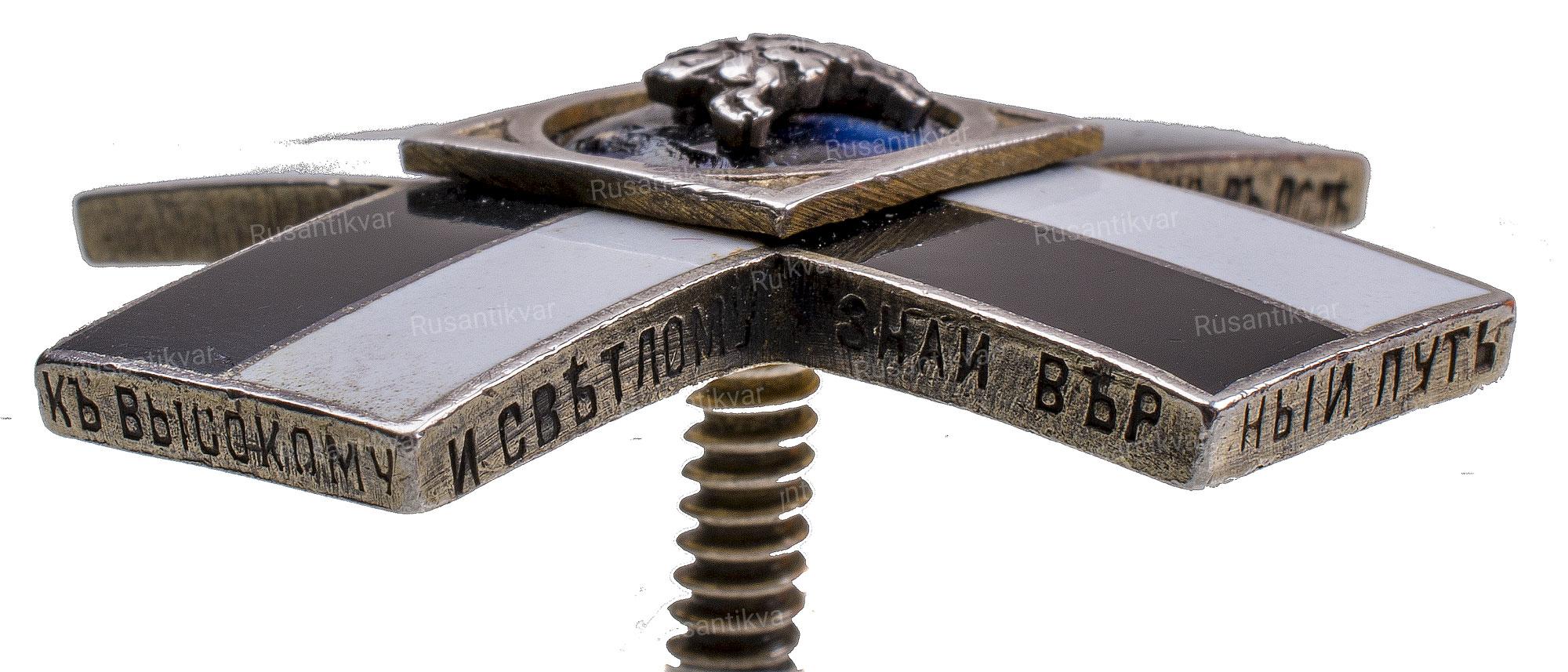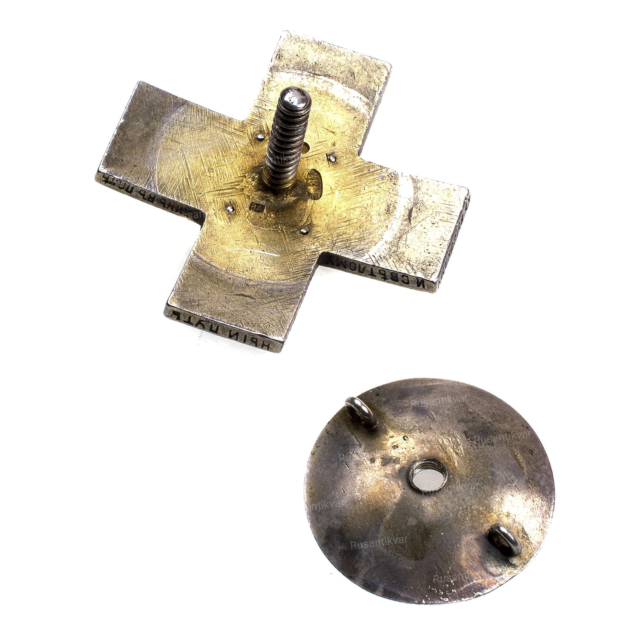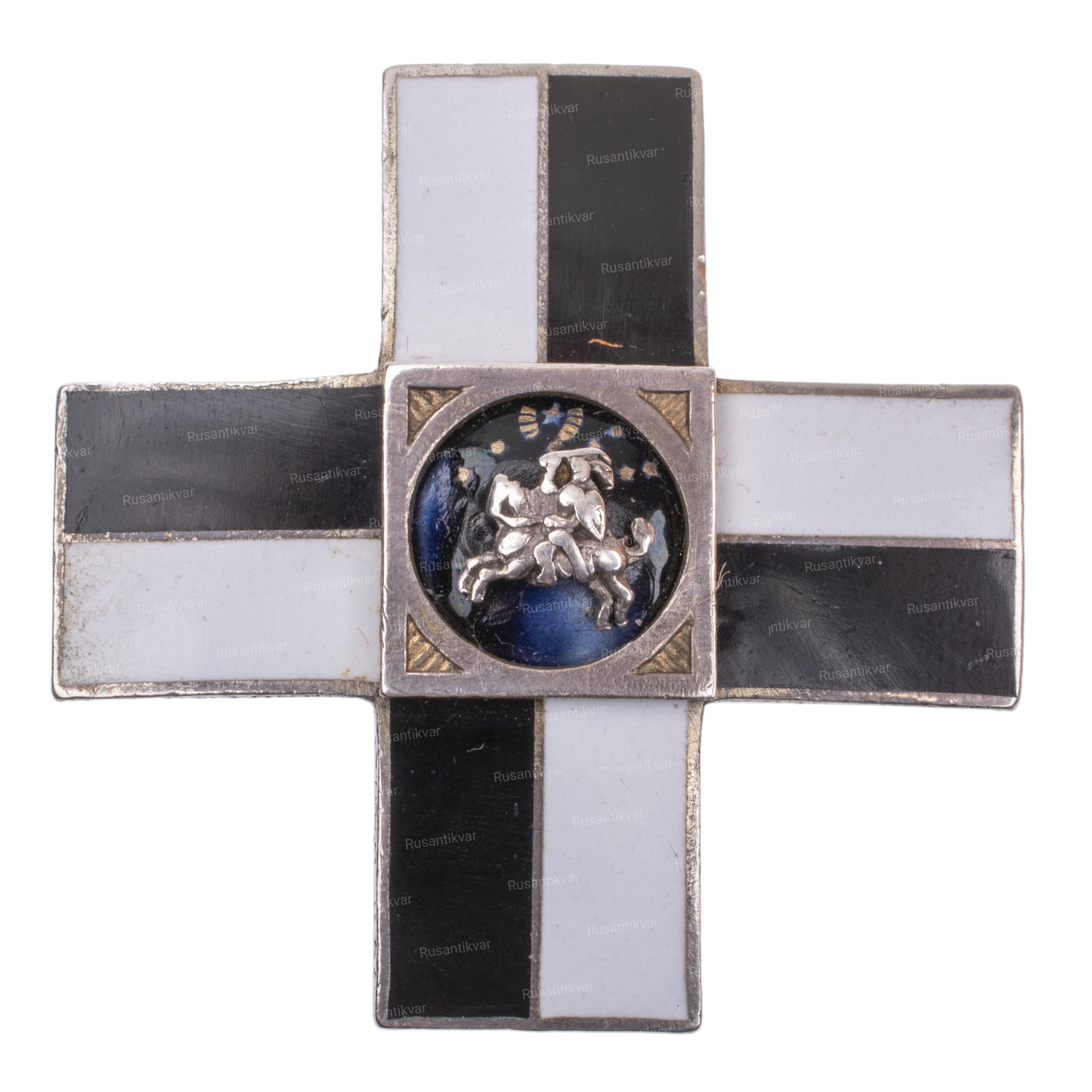 Клейма на оборотной стороне знака под винтом: Петроградского окружного пробирного управления с пробой металла [женская головка в кокошнике, вправо, 84] в овальном щитке; знак удостоверения [женская головка в кокошнике, вправо, в круглом щитке] и именное клеймо «ВД». Серебро, позолота, эмаль, 26.85 г. Размеры 41 х 40,9 мм. Сохранность отличная. Патрикеев, Бойнович.1# 1.2.17. Довольно редкий.