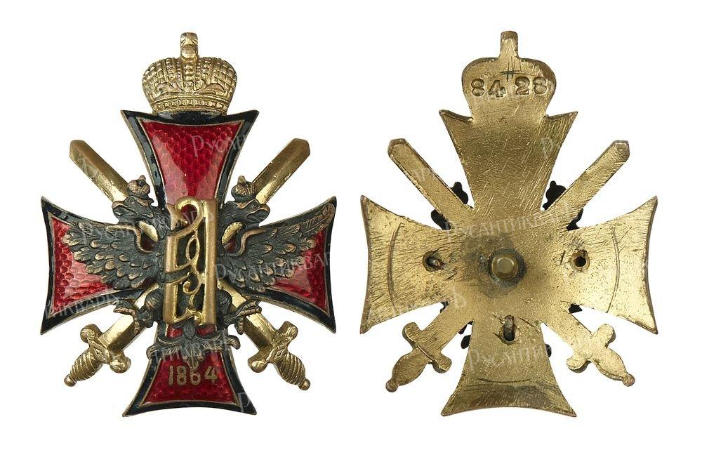 Нагрудный знак училищу был присвоен в 1913 году. В его центре размещался красный крест с золотым и чёрным ободком по краям, увенчанный золотой Императорской короной. Под крестом располагались скрещенные тесаки. Посередине знака был накладной двуглавый орел, на котором был изображен золотой вензель цесаревича Алексея Николаевича в виде буквы «А», как и на погонах. На нижнем конце креста была надпись «1864» — год основания училища.