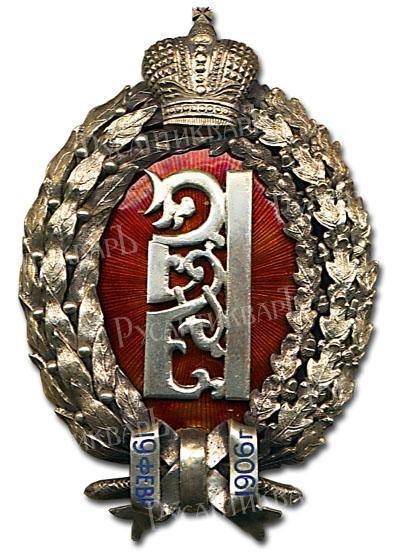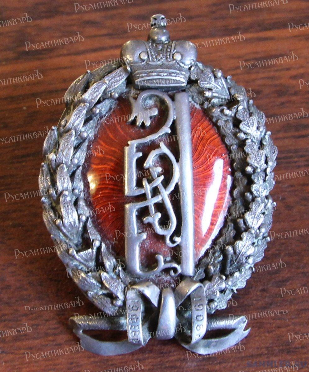 Нагрудный юбилейный знак. Юбилейный знак был утвержден в 1908 году в память назначения шефом училища Наследника Цесаревича Алексея Николаевича, право ношения знака было предоставлено служившим в училище в день назначения августейшего шефа генералам, офицерам и классным чинам, a также и юнкерам, состоявшим в тот же день в училище. Знак выгядел как серебряный венок, перевязанный лентой на которой была выгравина надпись: «19 февраля 1906 г.» — дата 1906г.,назначения цесаревича Алексея шефом училища. Внутри венка на красном эмалевом выпуклом щите был изображен серебряный вензель наследника «А» под Императорской короной.
