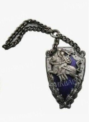 Знак утвержден 27 февраля 1915 года. Форма училищного нагрудного знака была принята в результате объявленного конкурса, на котором был принят проект полковника Генерального Штаба С. В. Томилина (с 19.02.1910 по 31.03.1914 состоявшего в прикомандировании к училищу, для преподавания военных наук), и имела форму правильного креста. Причём каждая часть креста состояла из белой и чёрной эмалевых пластинок, знаменовавших: белая — идею ордена Святого Георгия, идеал каждого военнослужащего, чёрная — идею могильного креста, как идею готовности на жертвенность жизнью. В центре, на круглом фоне было изображение Георгия Победоносца (в окончательном варианте — скачущий литовский всадник «Погоня» — символ, восходящий к истории Великого княжества Литовского).На верхнем конце, на чёрном поле, белый эмалевый вензель Александра II, на чёрном — золотой вензель Николая II. В центре «пряжка» училища (на чёрном фоне со звездами скачущий литовский всадник). На боковых срезах креста девизы училища: «Виленецъ одинъ въ поле и тотъ воинъ. Къ высокому и светлому знай верный путь». Диаметр 40 мм.Бронза.