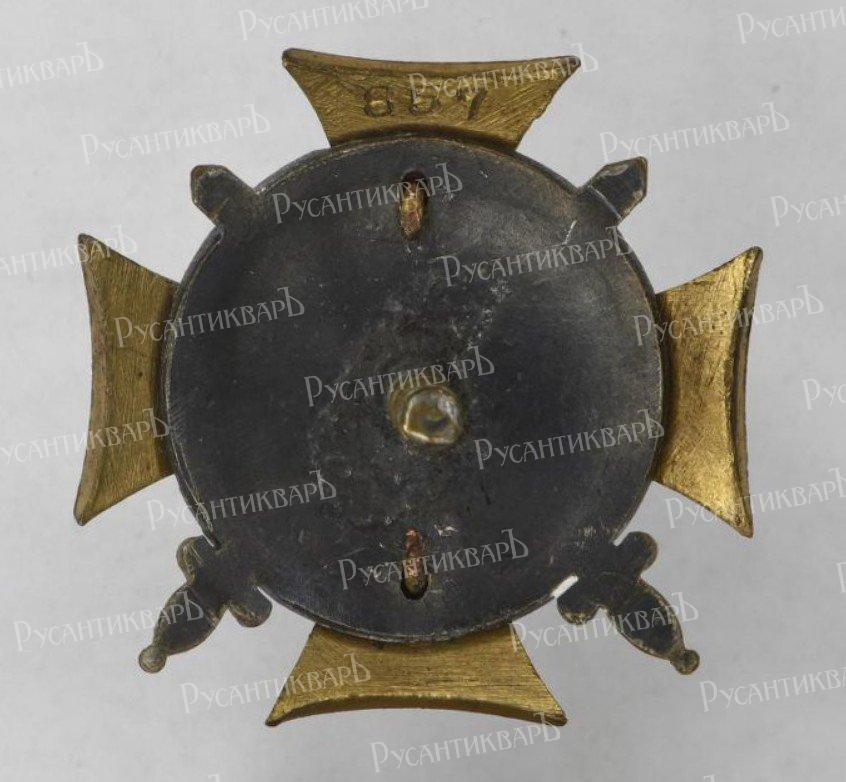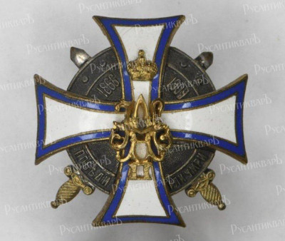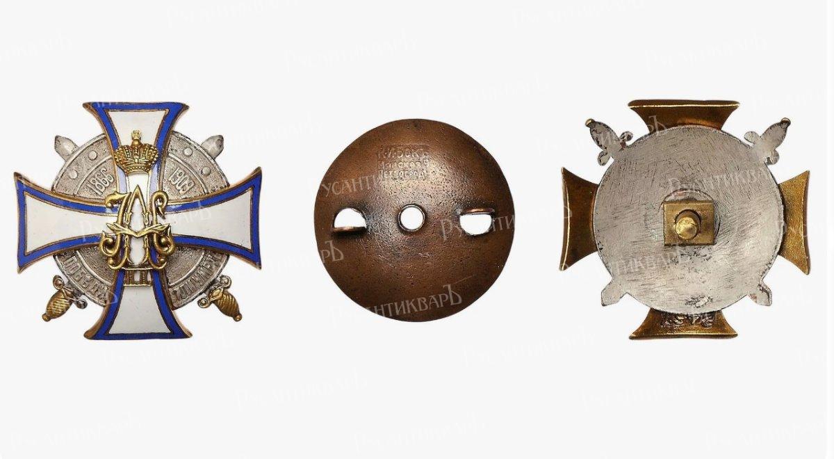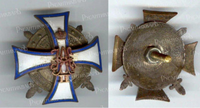 Знак училища. Белый крест с синим и золотым ободками, в центре которого накладные соединенные золотые вензеля Императоров Александра II и Николая II под Императорской короной. Крест положен на круглый оксидированный «Казанский» щит, на котором рельефные надписи: наверху — «1866-1909», а внизу - «Победи или умри». Щит лежит на двух скрещенных тесаках с золотыми рукоятями.
