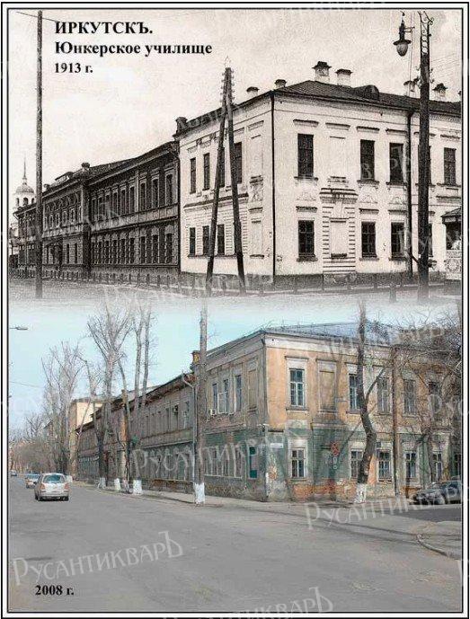 Первое время Иркутское юнкерское училище размещалось в деревянных зданиях, располагавшихся по улице Медведниковской (ныне ул. Халтурина). В 1879 все здания училища сгорели. После пожара училище разместилось в здании военной прогимназии. В 1882 училище было переведено в каменное здание бывшего военного госпиталя, находившегося на пересечении улиц Троицкой и Госпитальной (ныне улиц 5-й армии и Ярослава Гашека). 26 января 1912 военное ведомство выбрало земельный участок для строительства новых зданий военного училища, расположенный рядом с территорией будущего кадетского корпуса: между Загоскинской улицей (ныне ул. Ядринцева) на западе и Вагинской улицей на востоке, первой Иерусалимской (ныне ул. 1-я Советская) на севере и третей Иерусалимской (ныне ул. Трилиссера) на юге. Строительные работы начались в 1915.