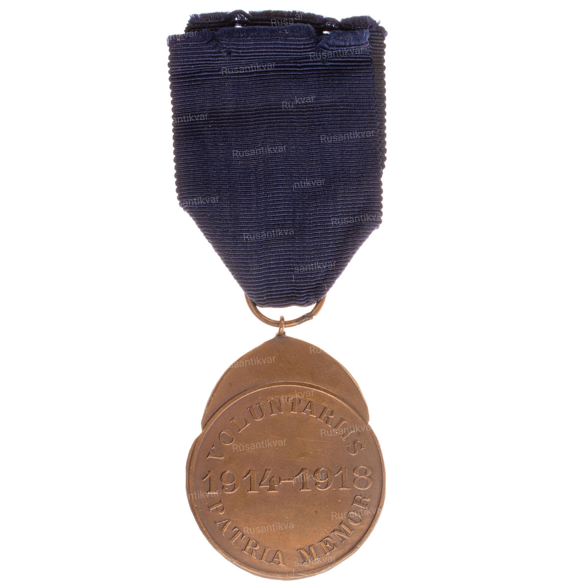 Медаль «Добровольческий комбат» 1914-1918 гг. Вручалась за добровольное зачисление и службу в боевой части в опасной зоне в течение не менее шести месяцев во время Первой мировой войны. Позже критерии отбора будут распространены на добровольцев старше 40 лет, которые служили в боевой части в опасной зоне в течение трех месяцев, или более 50 человек, которые служили месяц при тех же условиях, чем медицинский персонал, который служил два лет в неоккупированной Бельгии. Другие условия приписывания существовали для самых молодых, бежавших из оккупированной Бельгии, которые были ранены в боях или посмертно
