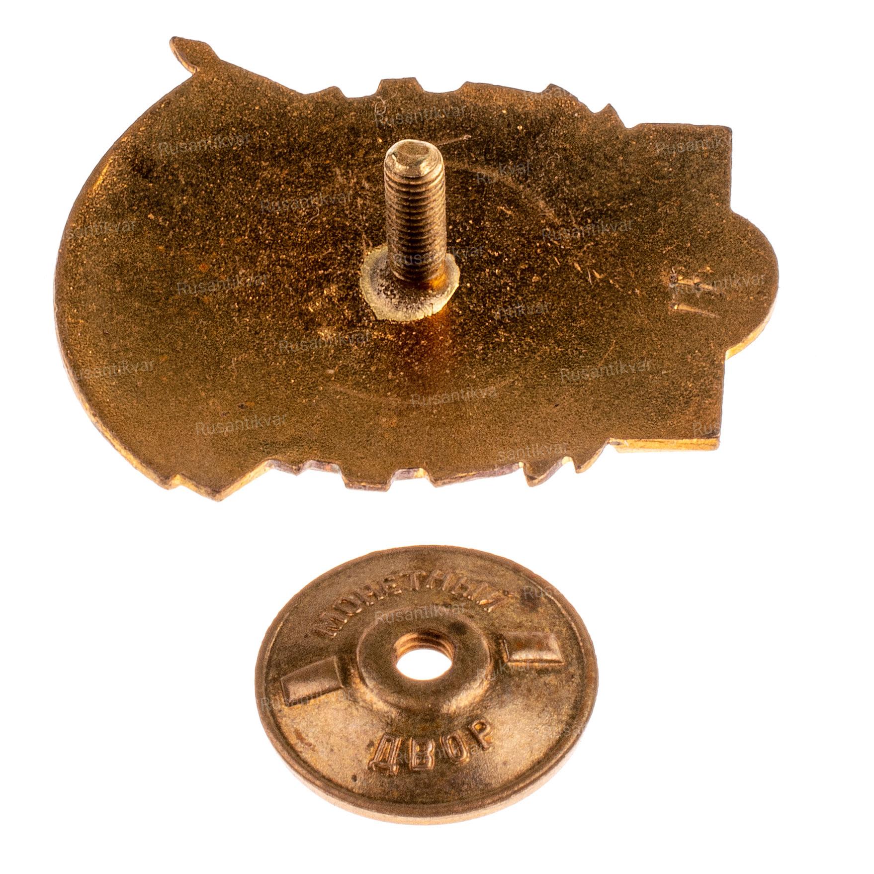 ММД, 1950-е гг. Бронза, позолота, эмаль, 11.35 гр. Размеры 36.4 × 29 мм. На гайке надпись «МОНЕТНЫЙ / ДВОР». Сохранность отличная (UNC). Ведомственные знаки отличия № 4.7.1. На обратной стороне знака аббревиатура ММД и выгравирован номер «2.899».