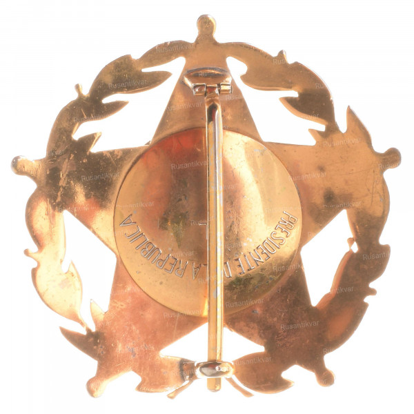 Четырехконечная позолоченная звезда с бисерным краем, с разветвленными лучами между руками, несущими лавровые ветви, на поворотной подвеске "Кондор Анд" с петлей для шейной ленты; на лицевой стороне круглый центральный медальон с изображением малого герба Чили красной, белой и синей эмалью внутри белой эмали кольцо; высота, включая кольцо с лентой, 94,65 мм (3,72 дюйма); ширина 51,48 мм (2,03 дюйма); звезда была поцарапана внизу справа и на подвеске condor . Награда была учреждена в 1947 году для награждения старших офицеров за долгую (обычно 30 лет) службу и выдающиеся поступки