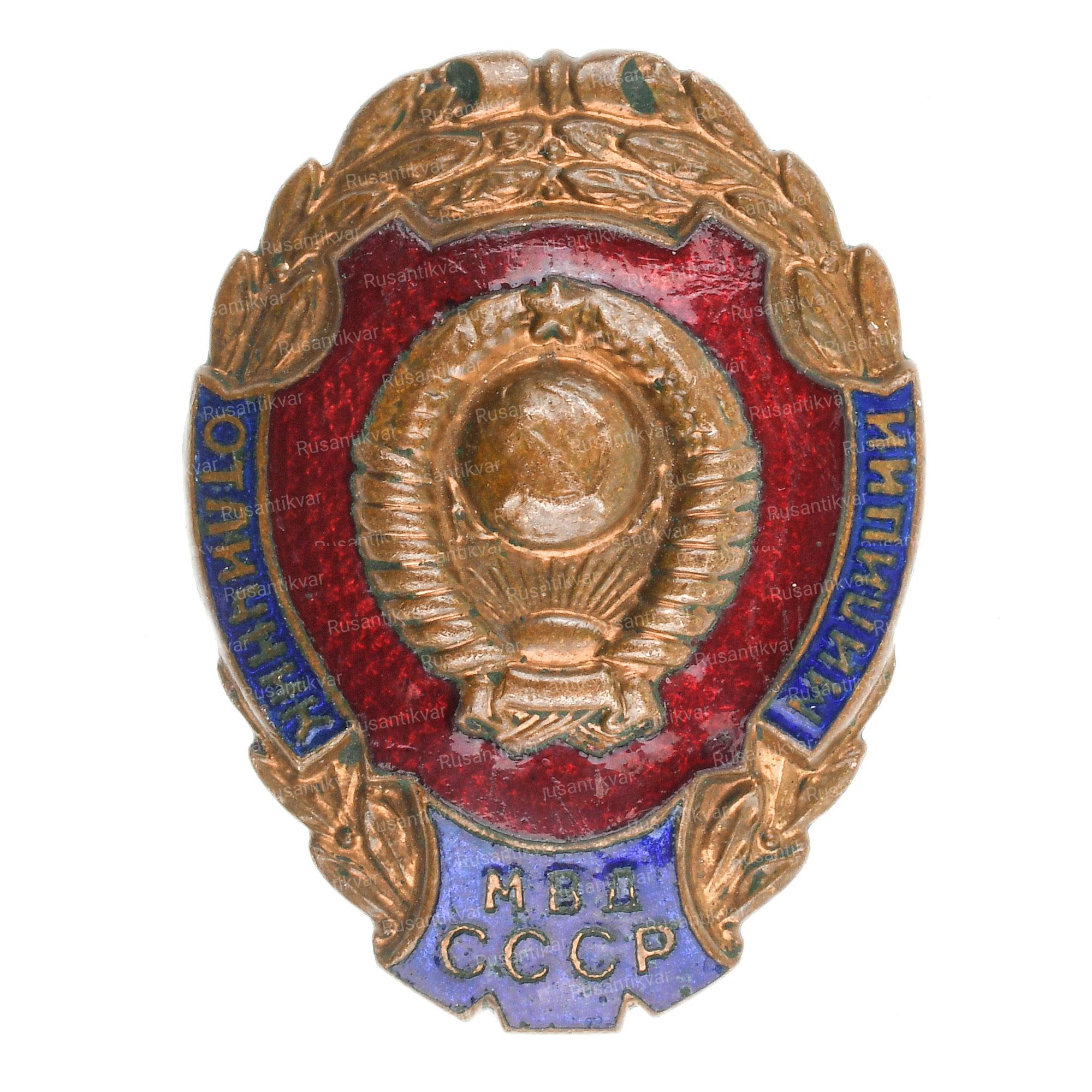 Нагрудный знак «Отличник милиции» образца 1953 года. Производственный выпуск 1953 -1960 гг. московского завода Победа. Знак отличник милиции МВД СССР был учрежден 23 декабря 1953 года для награждения сотрудников министерства за проявленные отличия в результате служебной деятельности.