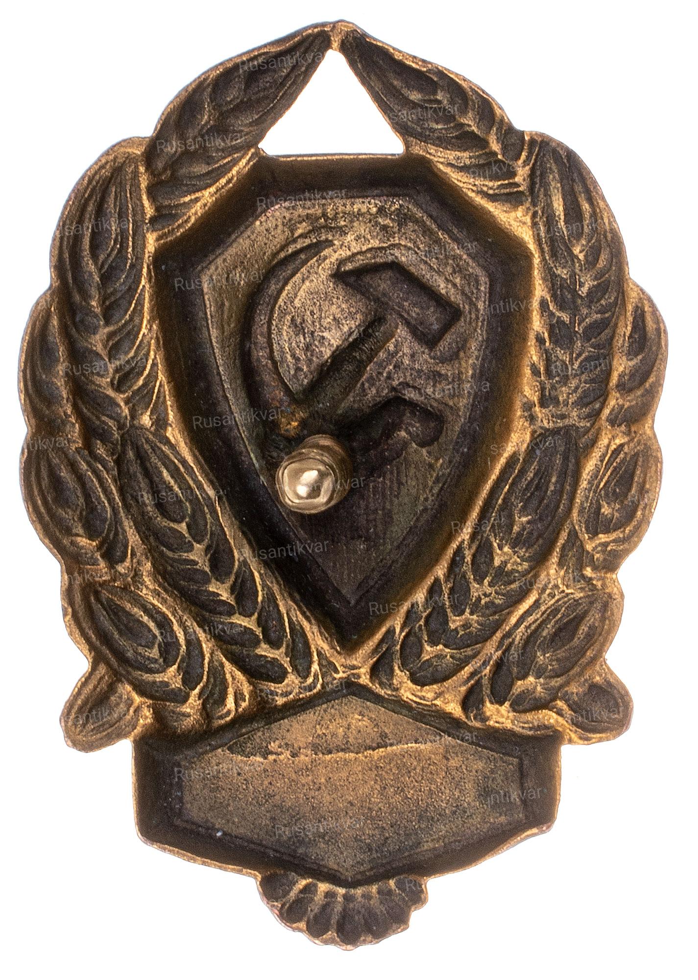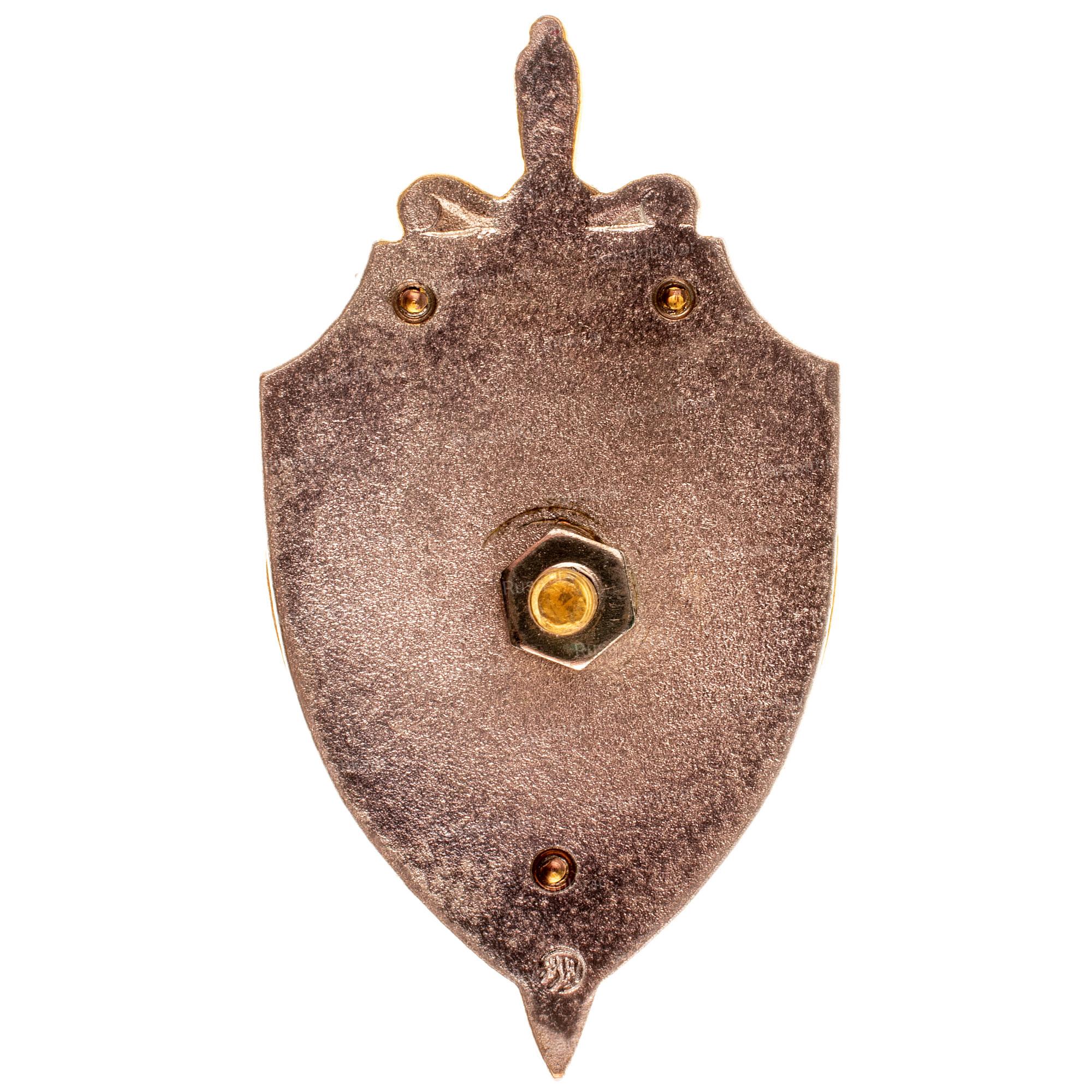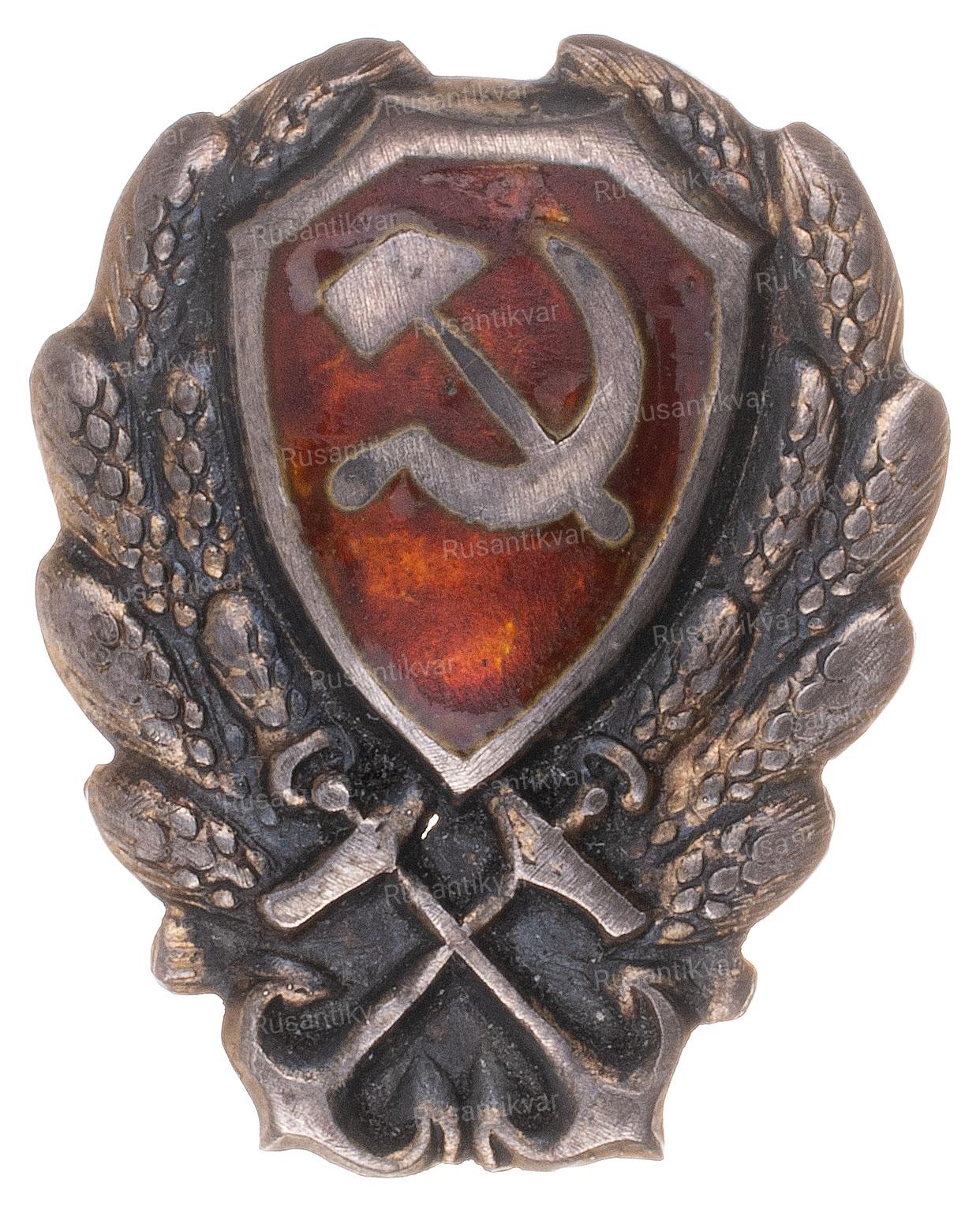 Отличительный нагрудный знак сотрудника рабоче-крестьянской милиции СССР. 1926–1928 г. Неизвестное производство. Бронза, эмаль. На гайке по окружности надпись: «ХУД. ГРАВ. на МЕТ.». Сохранность почти отличная. Сысолятин# 2.56. Аналог. см. Знаки отличия правоохранительных органов СССР # 1.1.12.