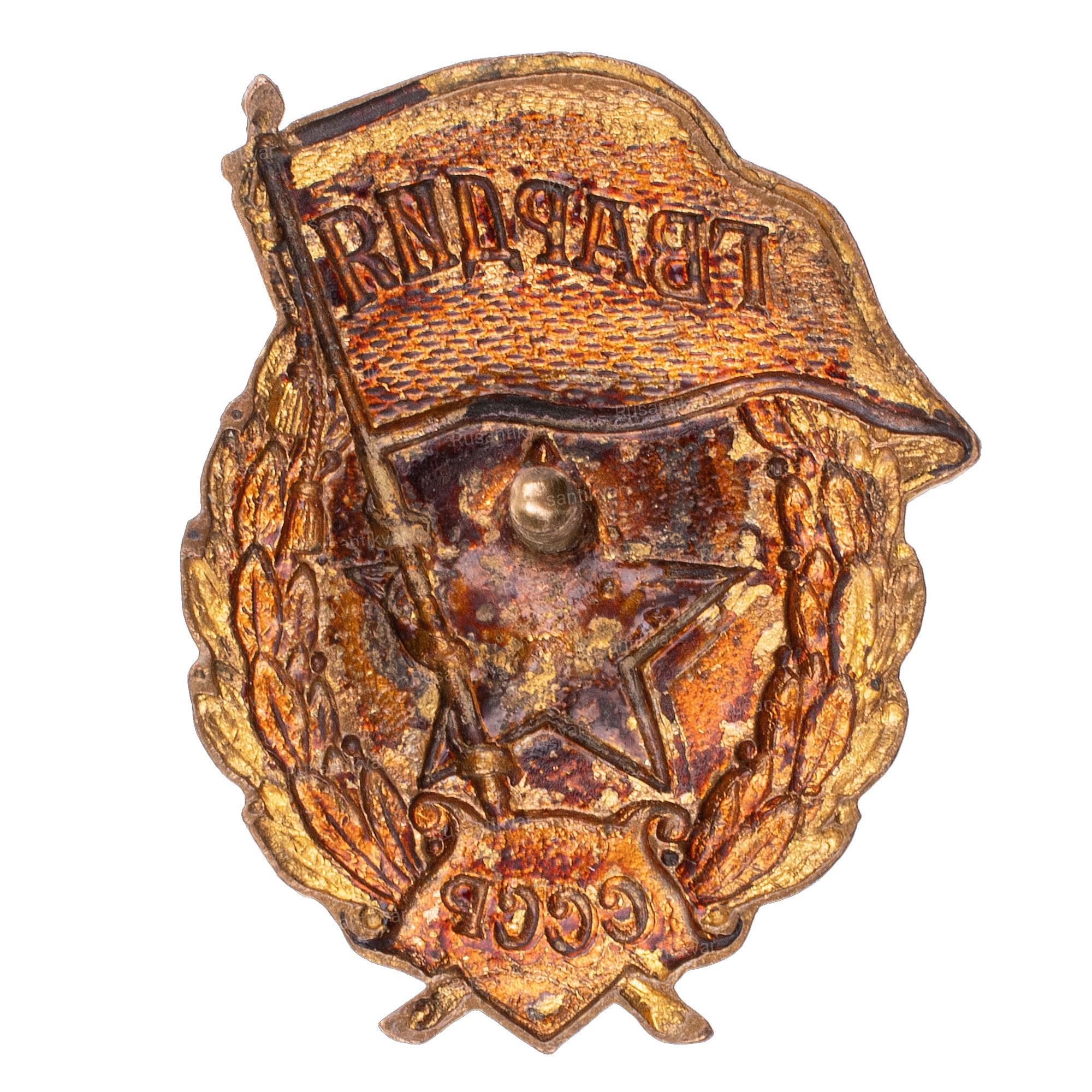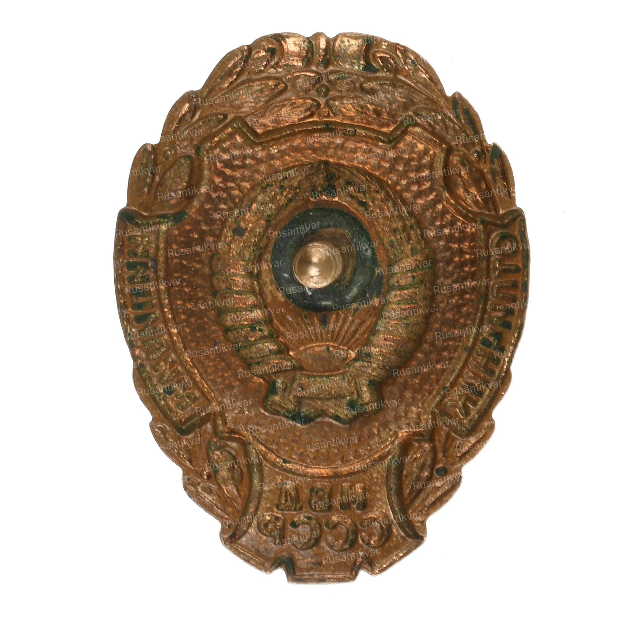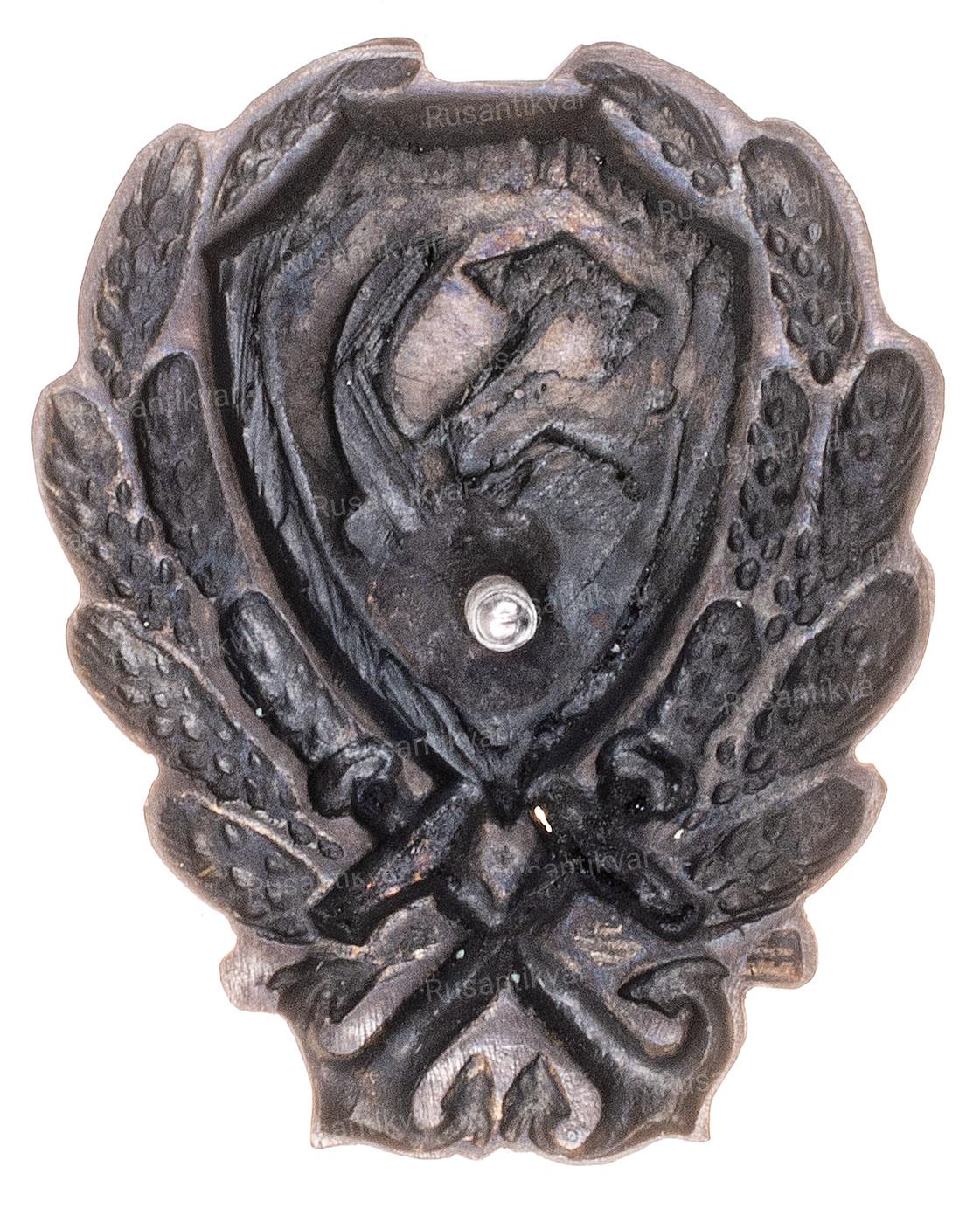 Отличительный нагрудный знак сотрудника рабоче-крестьянской милиции СССР. 1926–1928 г. Неизвестное производство. Бронза, эмаль. На гайке по окружности надпись: «ХУД. ГРАВ. на МЕТ.». Сохранность почти отличная. Сысолятин# 2.56. Аналог. см. Знаки отличия правоохранительных органов СССР # 1.1.12.