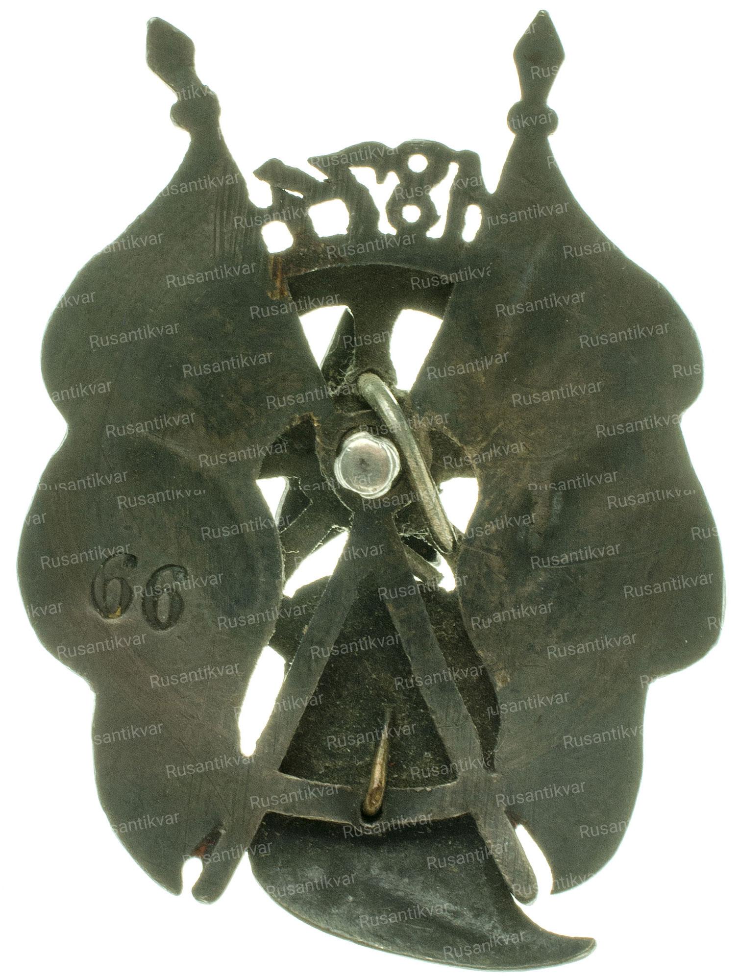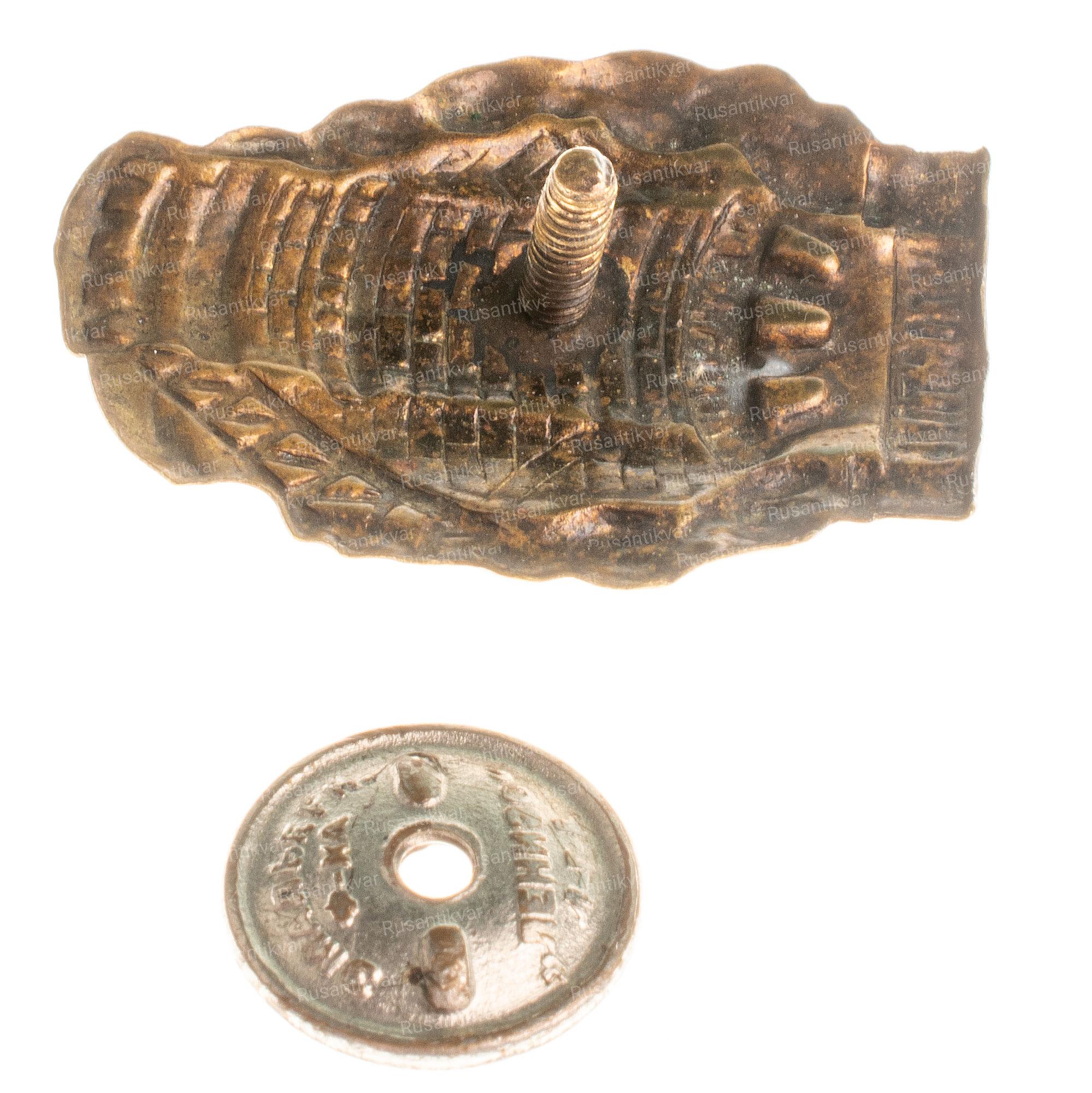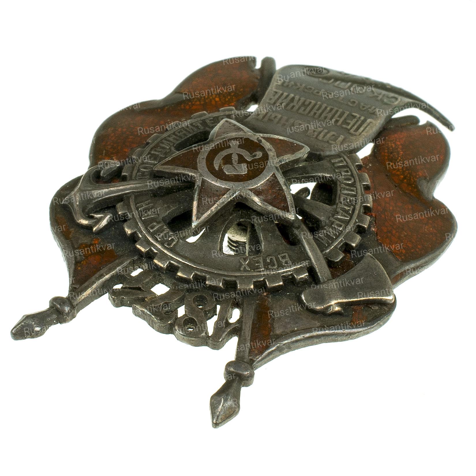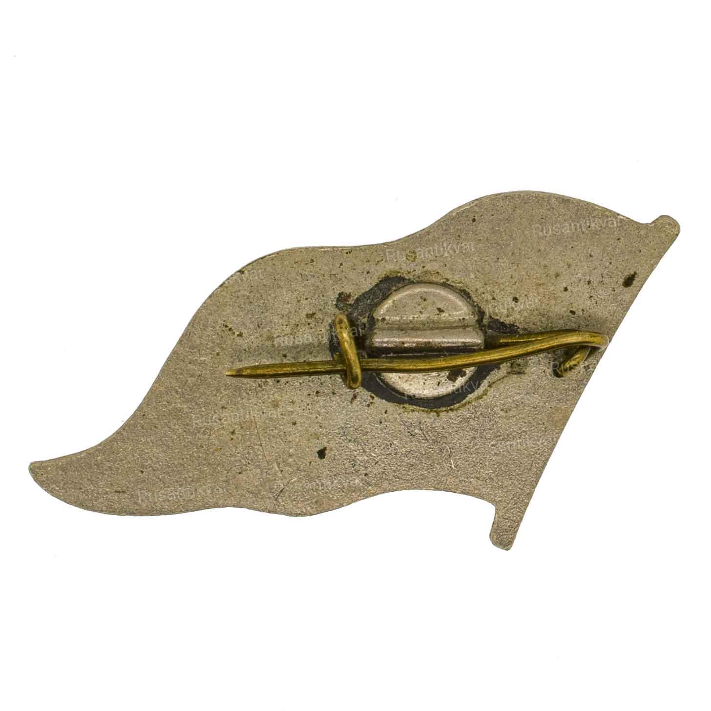 Знак в память 50-летия Главных Ленинских мастерских СКОПС, № 66. СССР, 1924 г. Неизвестная мастерская. Без клейм. Серебро, эмаль, 20,67 г. Размеры 46,1×34,3 мм. Сохранность очень хорошая, эмаль частично утрачена, красивая патина. На об. ст. знака слева выбит номер: «66». Принадлежал С.Г.Климову. На подложке выгравированы инициалы и фамилия владельца знака: «С.Г.Климов». Очень редкий.