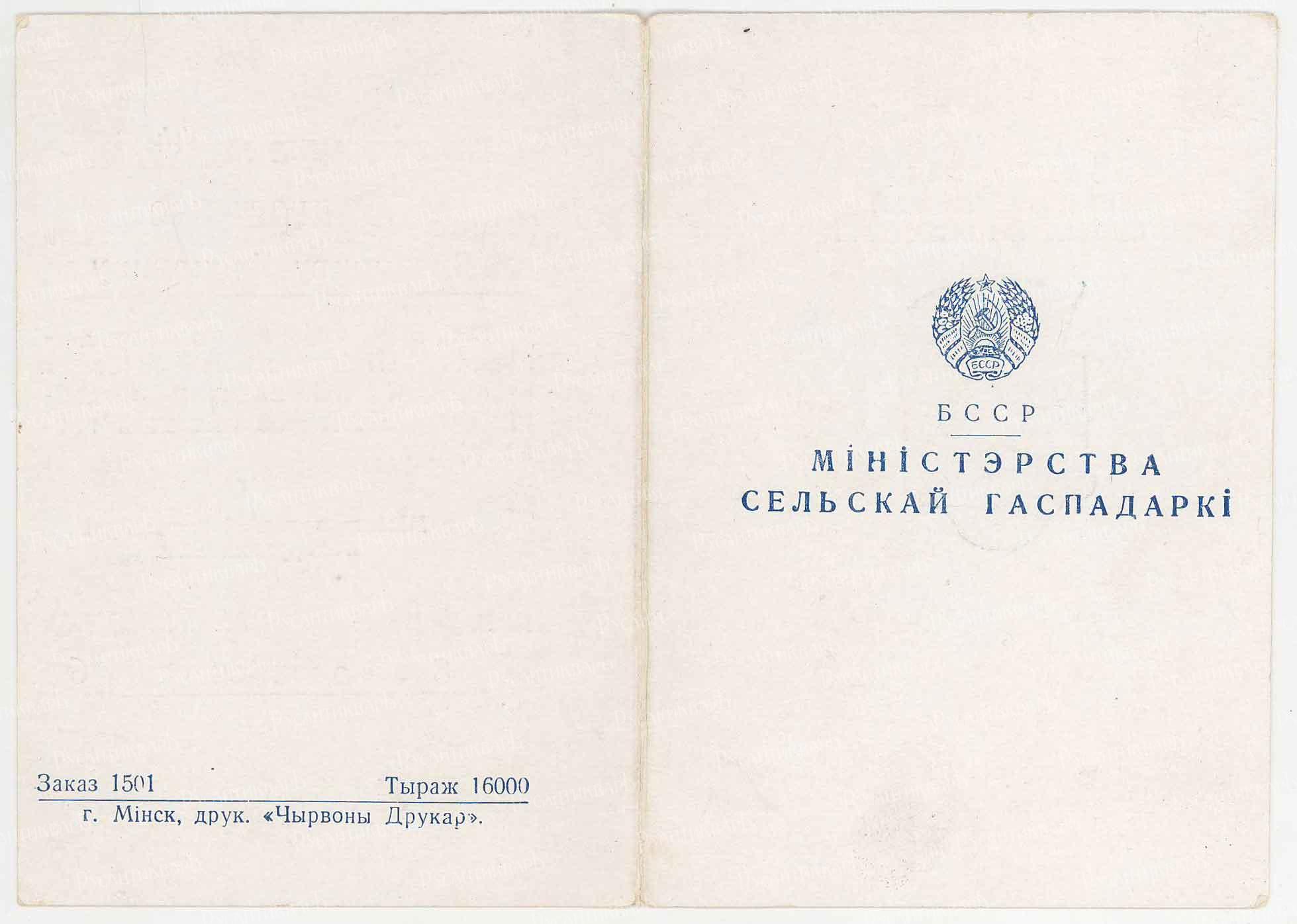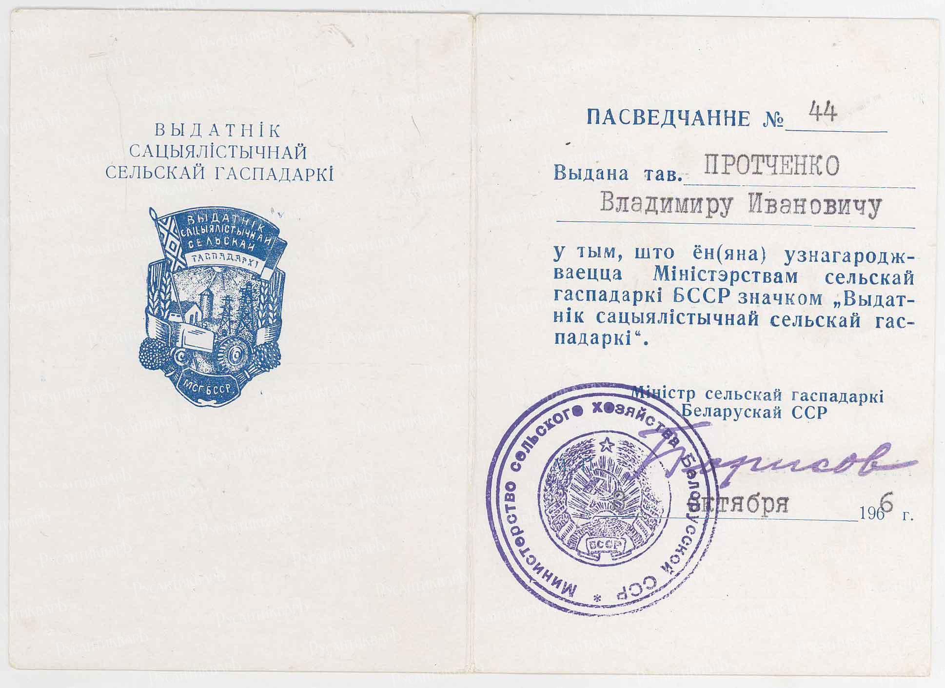 Знак "Отличник сельского хозяйства МСХ Белорусской ССР", б/н с документом.