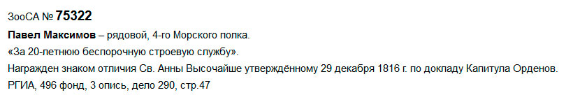 Знаком отличия за №75.322 награжден Максимов Павел – рядовой, 4-го Морского полка. "За 20-летнюю беспорочную строевую службу".Высочайше утвержденному 29 декабря 1816 г. по докладу Капитула Орденов.РГИА, 496 фонд, 3 опись, 290 дело, Лист 47