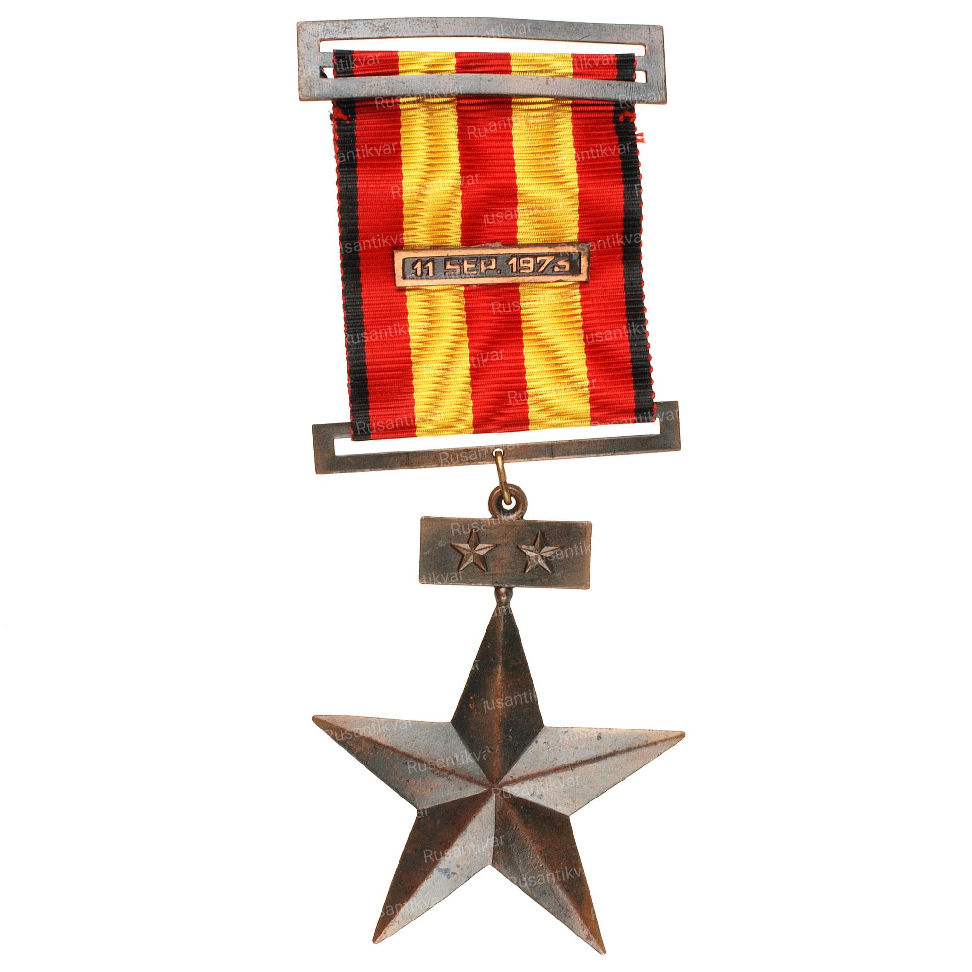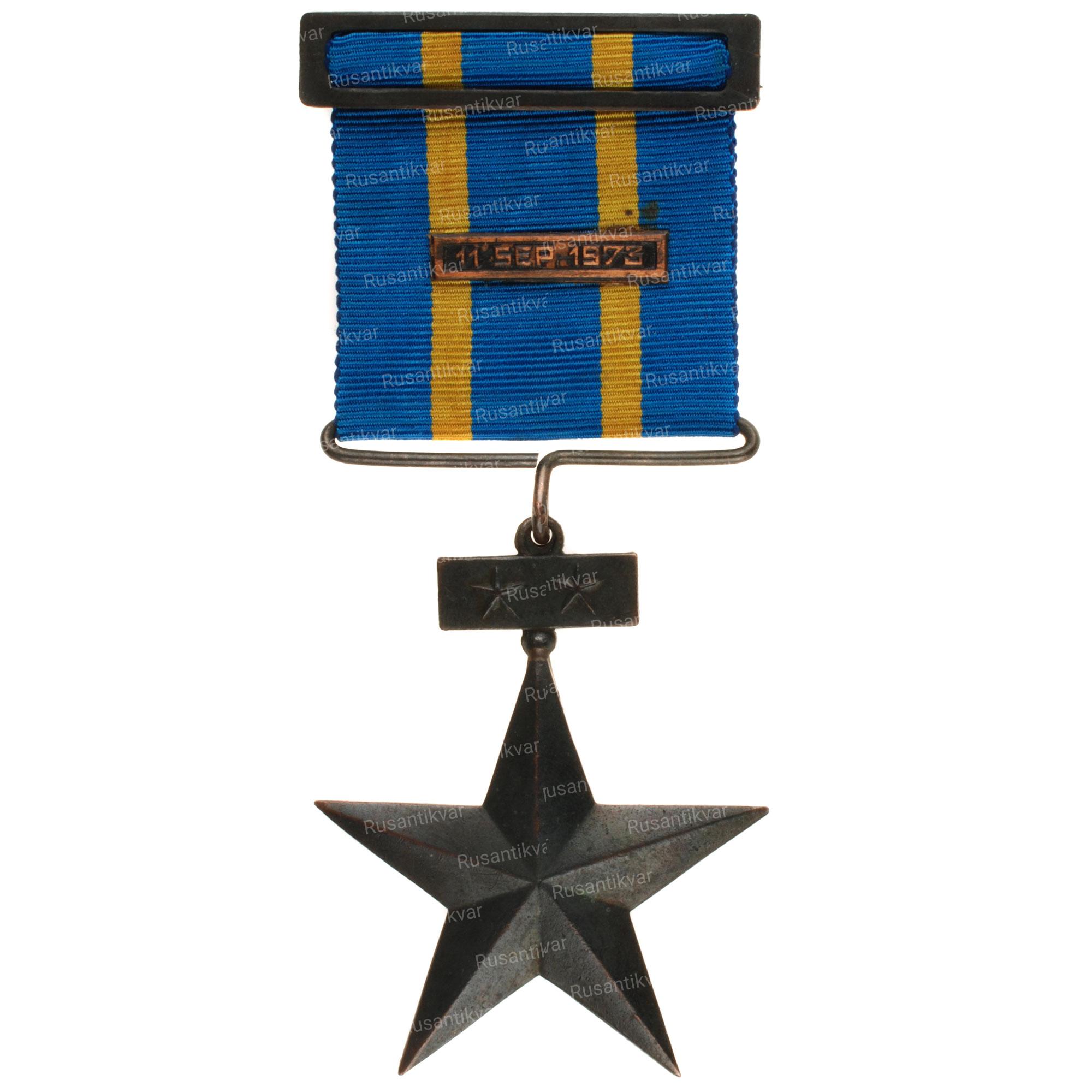 Пятиконечная черненая Бронзовая звезда с подвесной планкой с пятиконечными звездами сверху и петлей для крепления ленты;Эта награда была учреждена 11 сентября 1973 года ,награждение предусматривалось для всех участников в трех классах. Для нижних чинов, офицеров и старших офицеров соответственно.Награда различалась цветом ленты для каждого рода войск.Красный для армии, светло-синий для Военно-Воздушных Сил, темно-синий для Военно-Морского Флота и зеленый для карабинеров .
