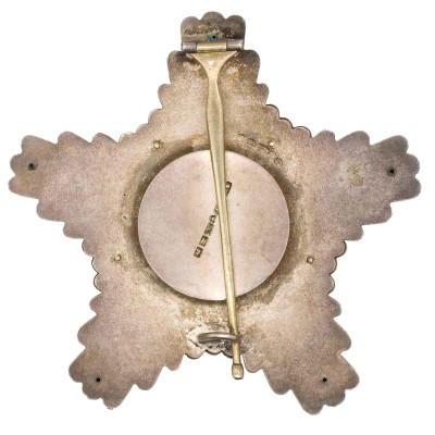 Серебряная пятиконечная звезда с позолоченными промежутками между лучами и позолоченным гербовым львом в центральном медальоне красной эмали.