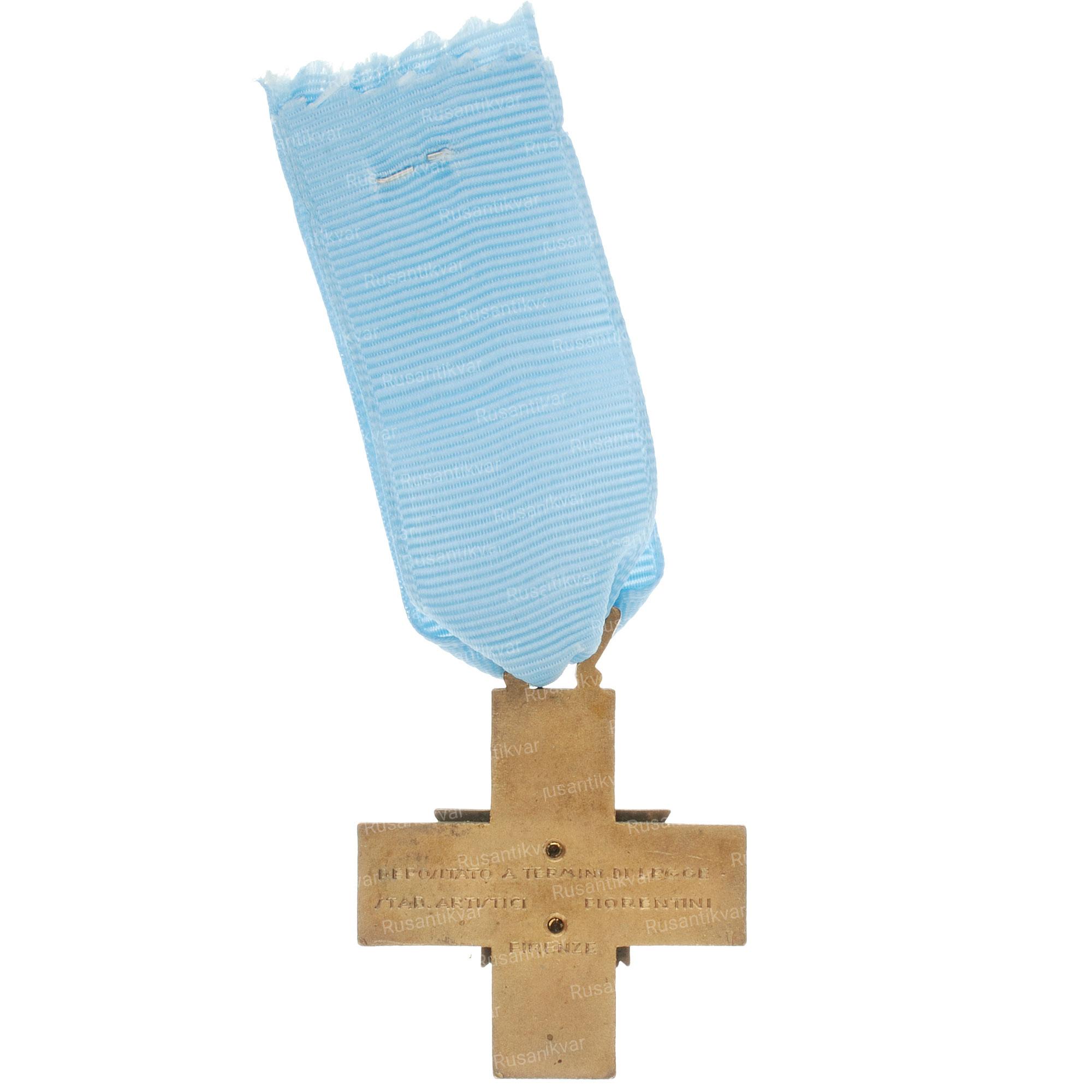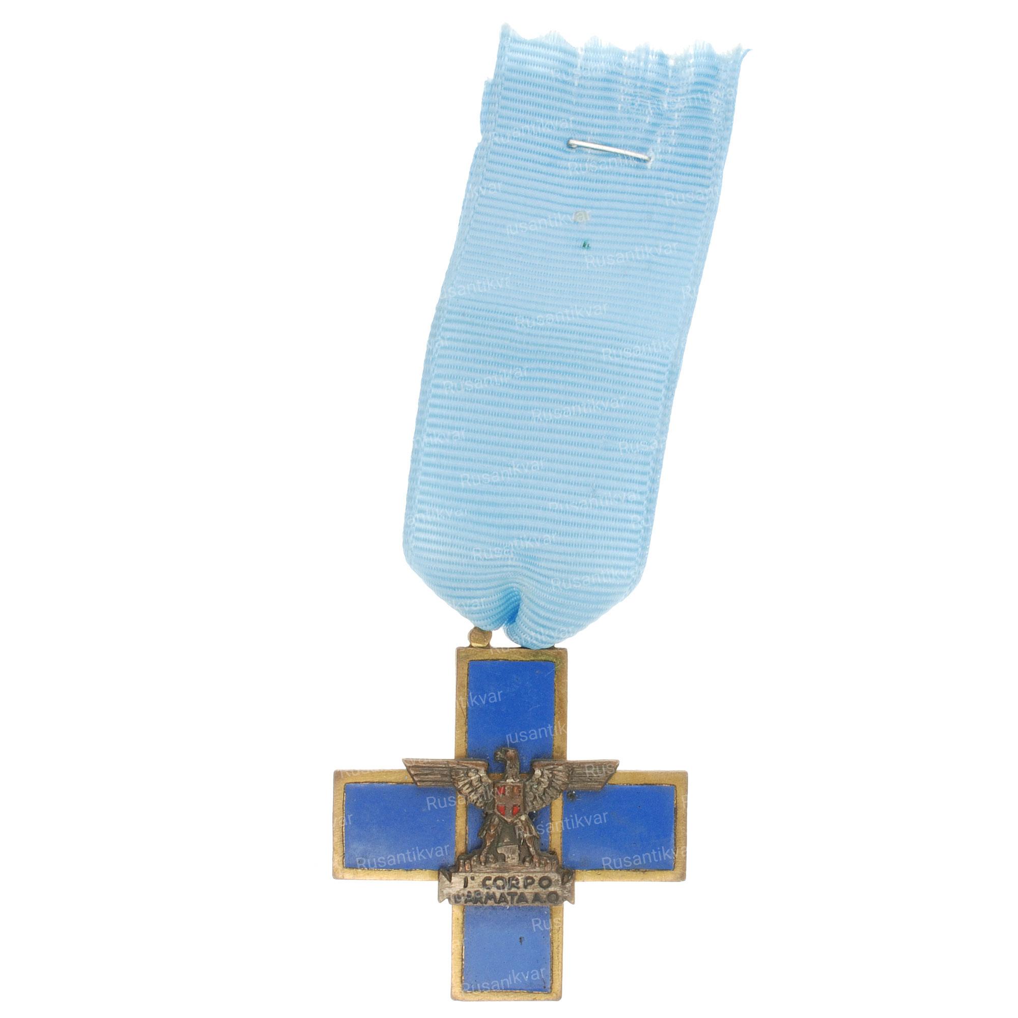 Памятный крест I корпуса (Croce commemorativa del I Corpo d’armata) был неофициальной наградой для военнослужащих корпуса, воевавших в Эфиопии. Награда представляла собой греческий бронзовый крест, залитый на аверсе голубой горячей эмалью. В центре креста накладной римский орел с расправленными крыльями и свитком в когтях. Реверс – плоский.