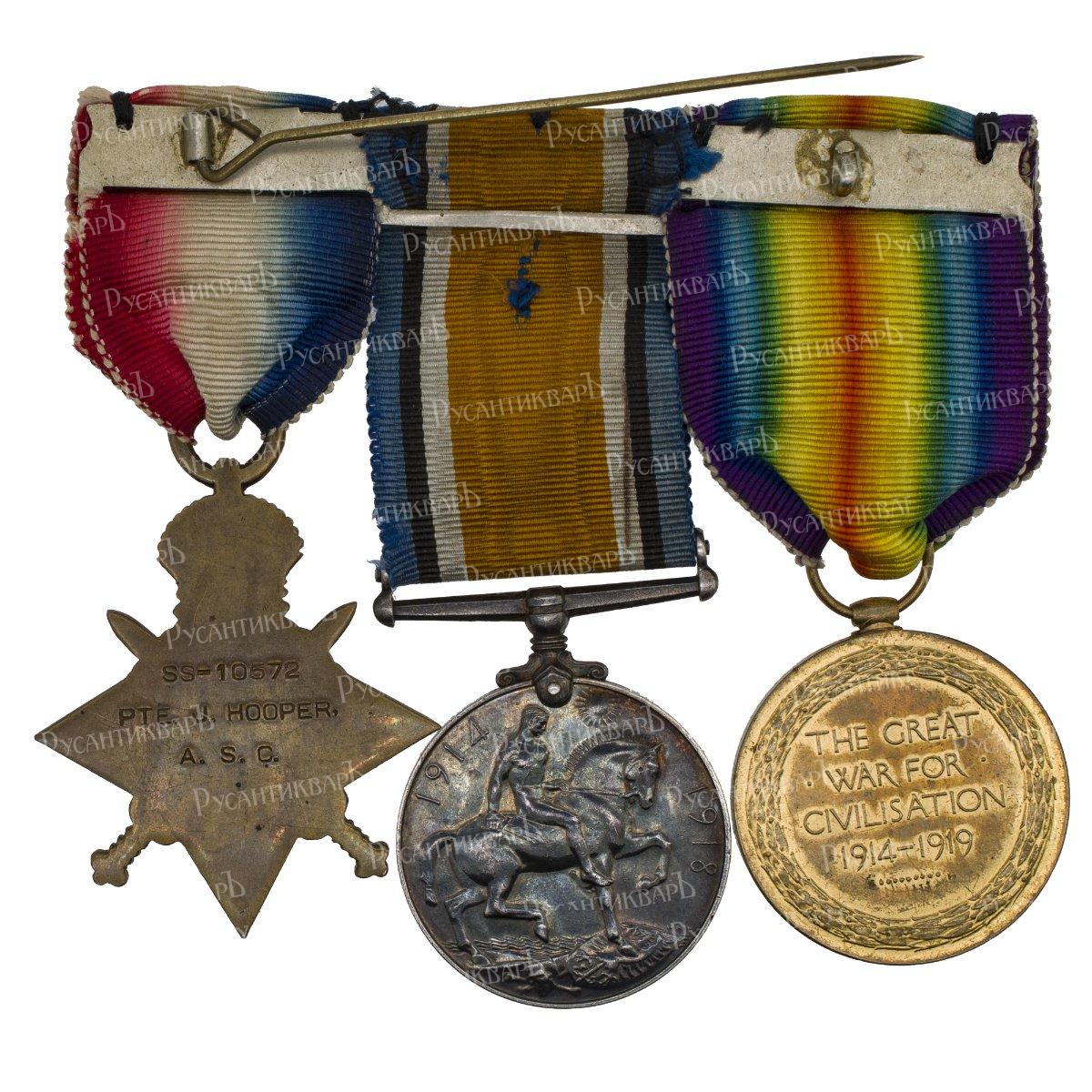 Великобритания (Королевство Великобритания 1707 - 2025 гг). Наградная колодка из 3 медали времён I Мировой войны. (ss-10572 PTE. ( Private - рядовой ) J.HOOPER. A.S.C.( Army Service Corps /Королевский корпус обслуживания Британской армии)).