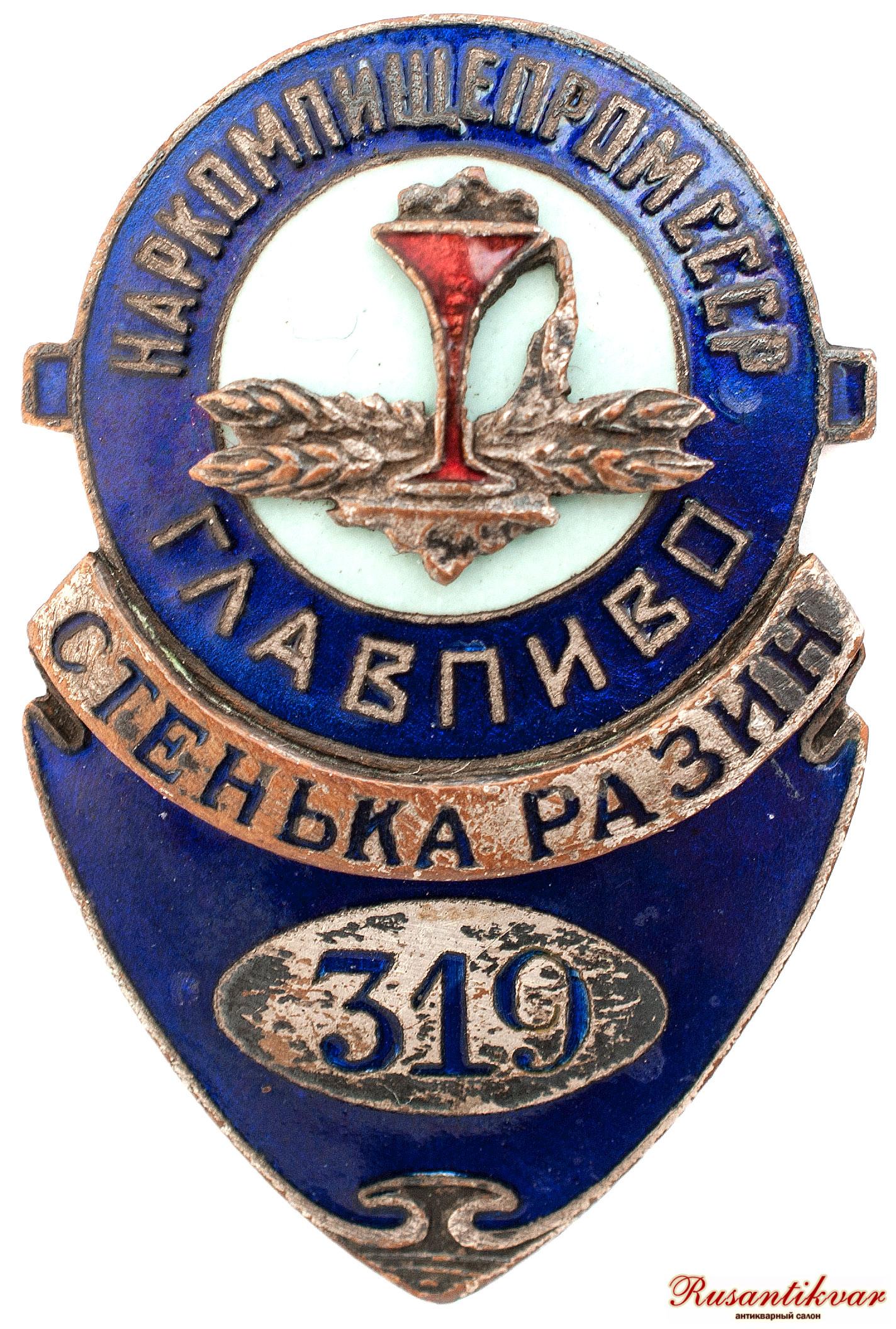 Служебный знак завода «Стенька Разин» Главпиво Наркомпищепрома СССР служебный №319
