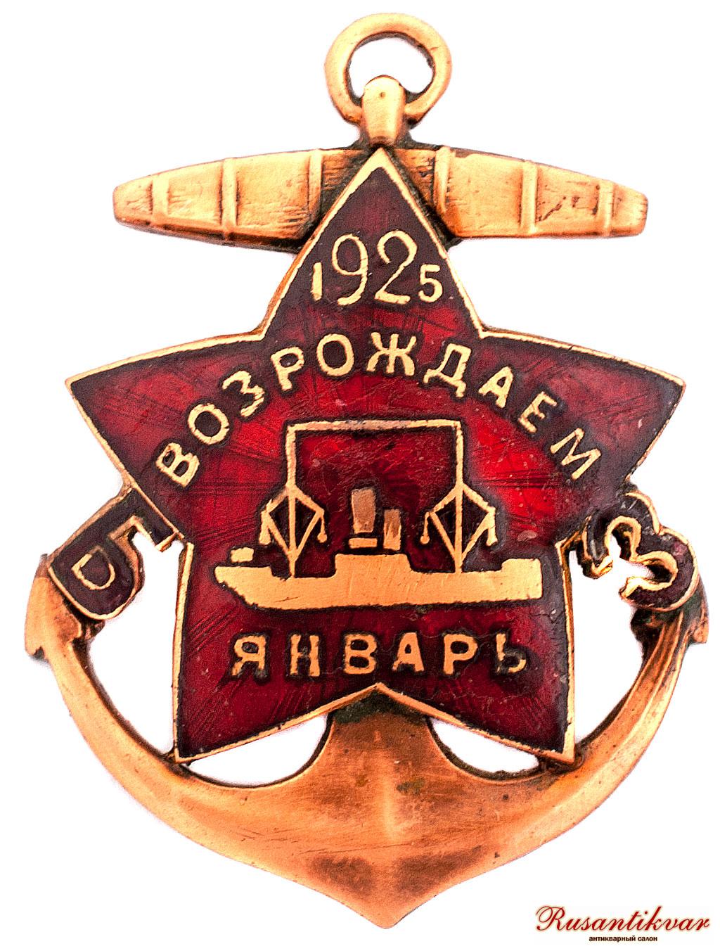 Знак «За отличия, проявленные при возрождении Балтийского завода» появился в 1925 году. Им награждали рабочих. Знак представлял собой адмиралтейский якорь с закрепленной поверх него массивной красной пятиконечной звездой. На ее поверхности контурно было изображено судно, а также размещалась надпись в три строки: «1925 - возрождаем январь». Слева и справа от звезды находились буквы аббревиатуры Балтийского завода. Знаки первой партии были изготовлены из серебра, впоследствии стали использовать бронзу.