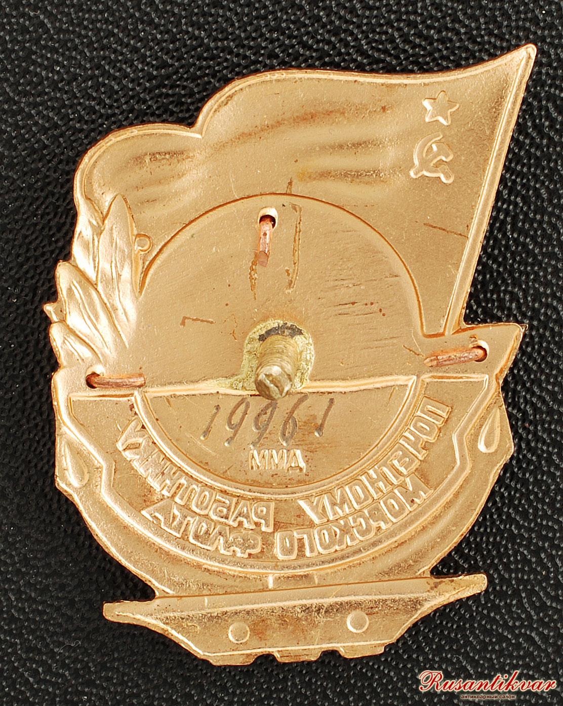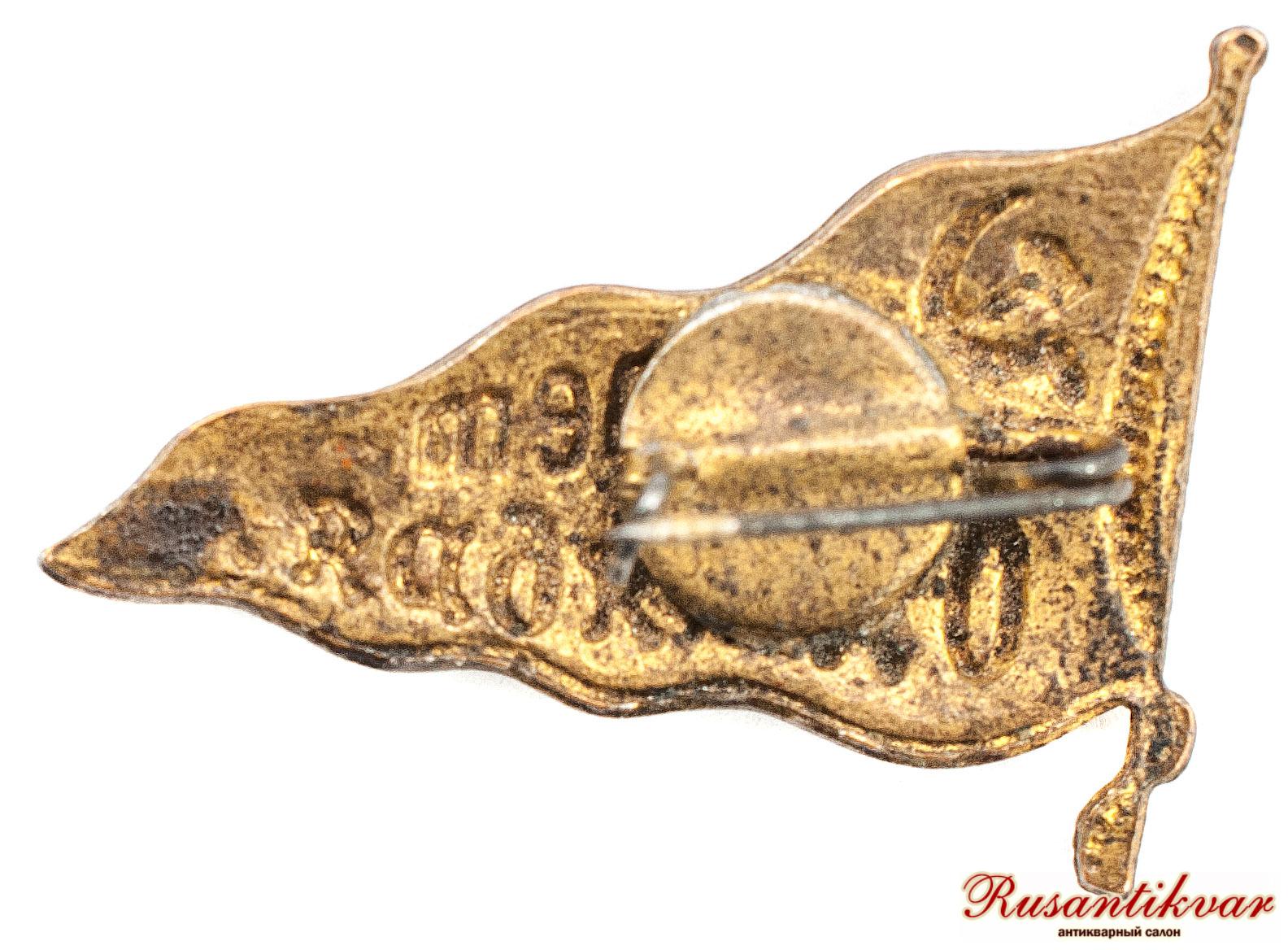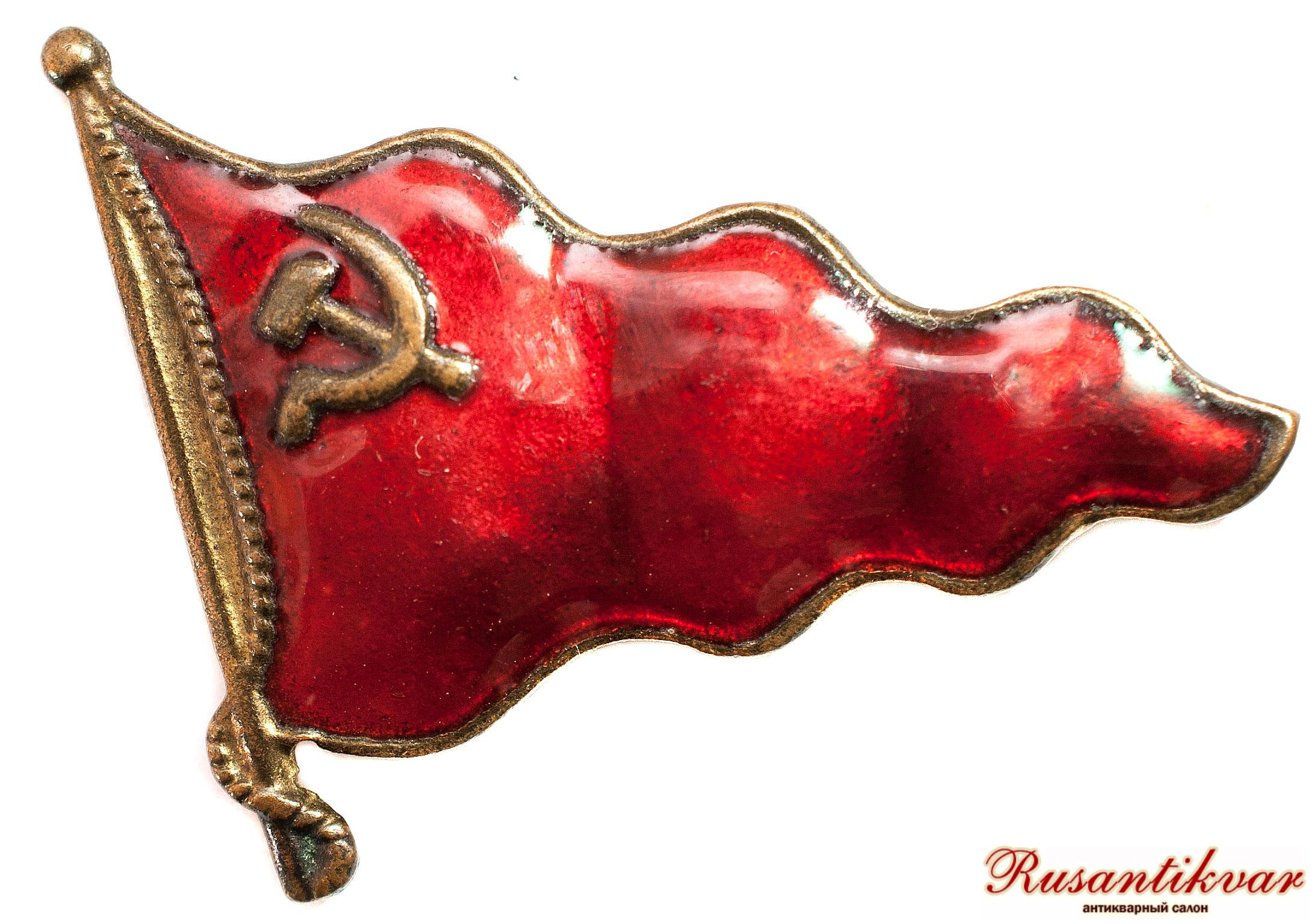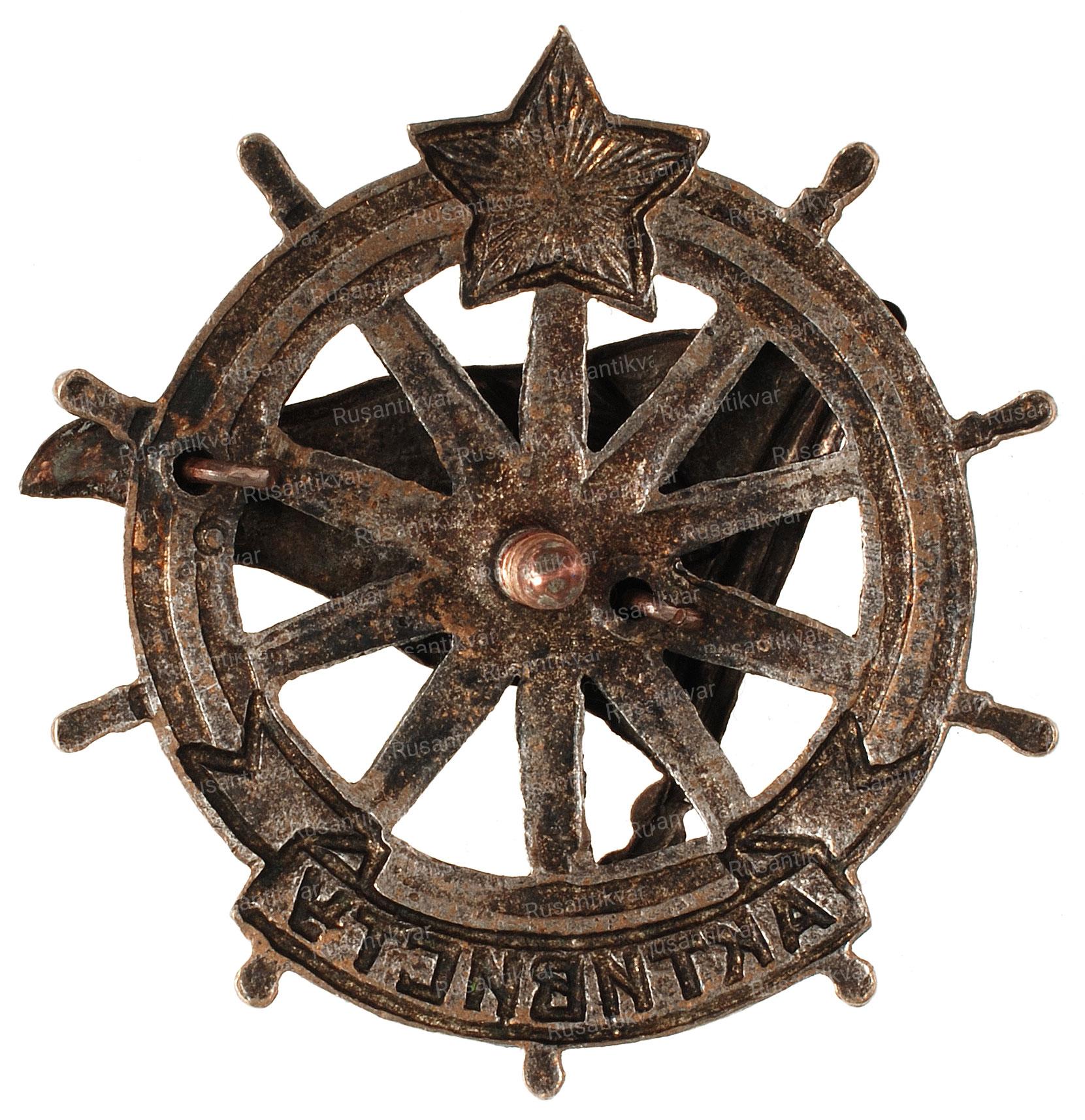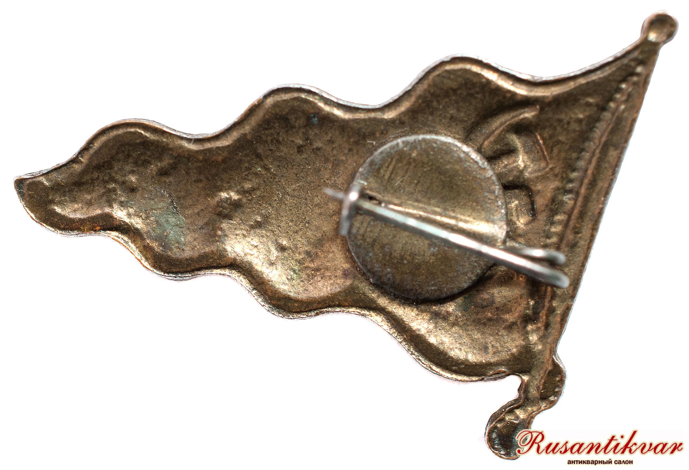 Железо, бронзирование, эмаль. 12 февраля 1926 г. вымпелы судов Черноморско-Азовского, Балтийского, Северного и Каспийского пароходств и флаг Добровольного флота были отменены в связи с созданием акционерного общества «Совторгфлот» и был утвержден единый вымпел Совторгфлота — красное треугольное полотнище с эмблемой «серп и молот». 30 января 1931 г. был образован Наркомат водного транспорта, а 9 апреля 1939 г. был образован Наркомат Морского флота. При этом вымпел был сохранен. В 1930-е гг. этот вымпел также стали носить на рукавах, соответственно правый и левый. Представленные вымпелы — левые. В декабре 1932 г. Постановлением Совнаркома СССР было образовано Главное управление Северного морского пути, а 7 марта 1934 г. был утвержден вымпел судов Главного управления Северного морского пути. Известны значки, выполненные в виде вымпелов, которые носились на кокарде головного убора и на рукавах, соответственно, левый и правый.