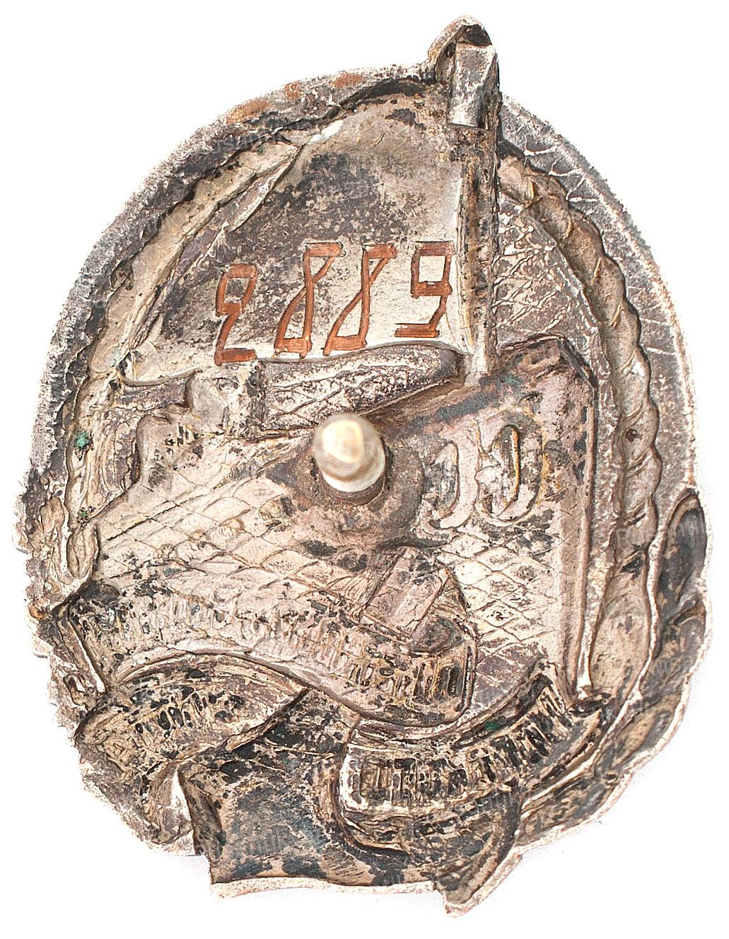 Значок «Отличник ВМФ», № 36. СССР, ЛМД, 1940 г. На об. ст. значка внизу выбито: «МД». На гайке вверху по окружности надпись: «МОНДВОР». Серебро, позолота, эмаль, 9,40 г. Размеры 28,6×23,9 мм. Сохранность очень хорошая, поверхностные сколы и царапины на эмали. Бойнович, Сибирцев# 2.13. Доценко# 19. Глейзер# 31. Утвержден в 1939 г. На об. ст. значка внизу выгравирован номер: «36». Тираж 9603 экз.