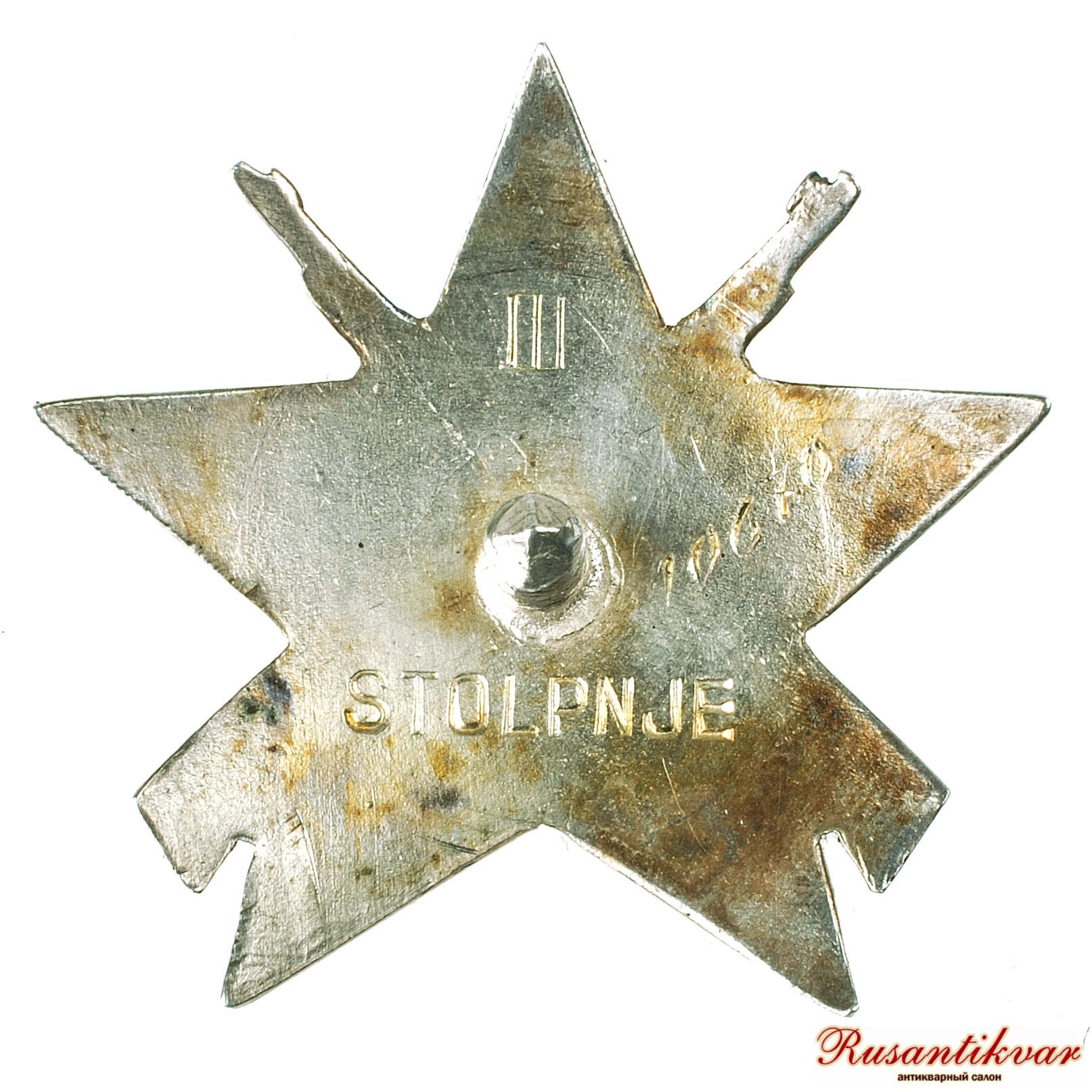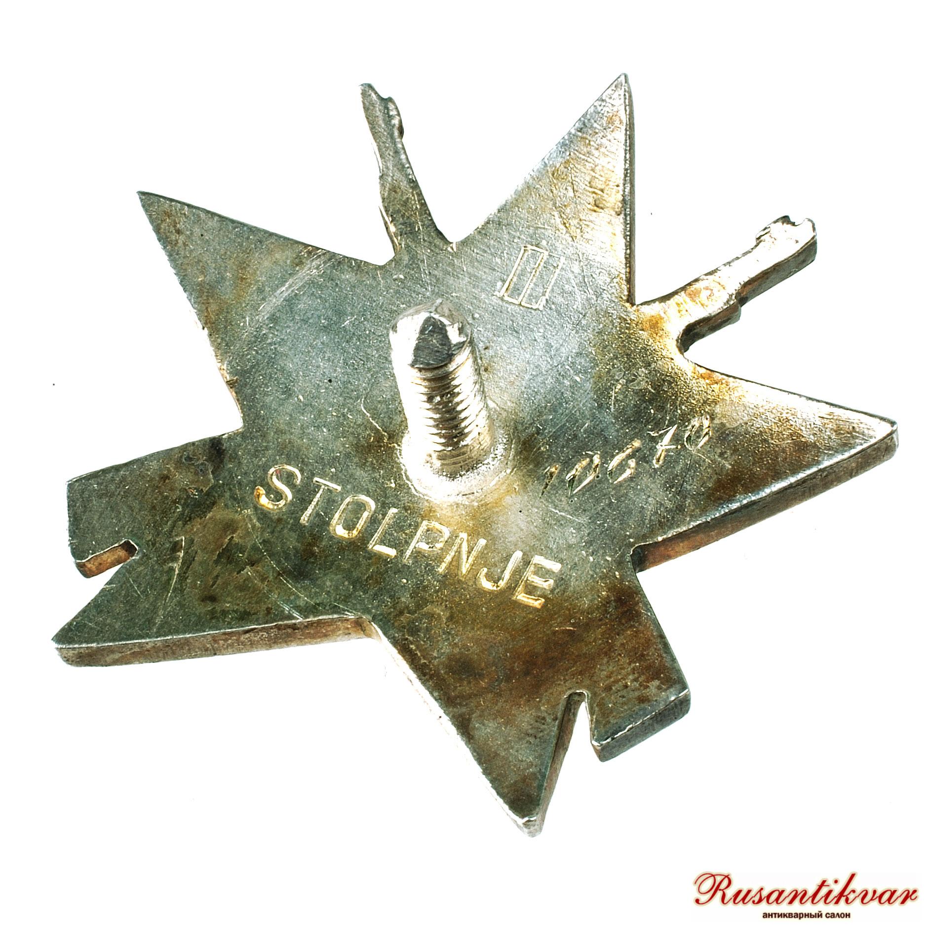 Вот что о нем пишет Википедия:Орден Партизанской звезды (сербохорв. Орден Партизанске звезде / Orden Partizanske zvijezde, макед. Орден на Партизанската звезда, словен. Red Partizanske zvezde) — военная награда Социалистической Федеративной Республики Югославии, одна из первых военных наград. Вручалась участникам Народно-освободительной войны Югославии за проявленные в боях храбрость и умелое командование войсками.