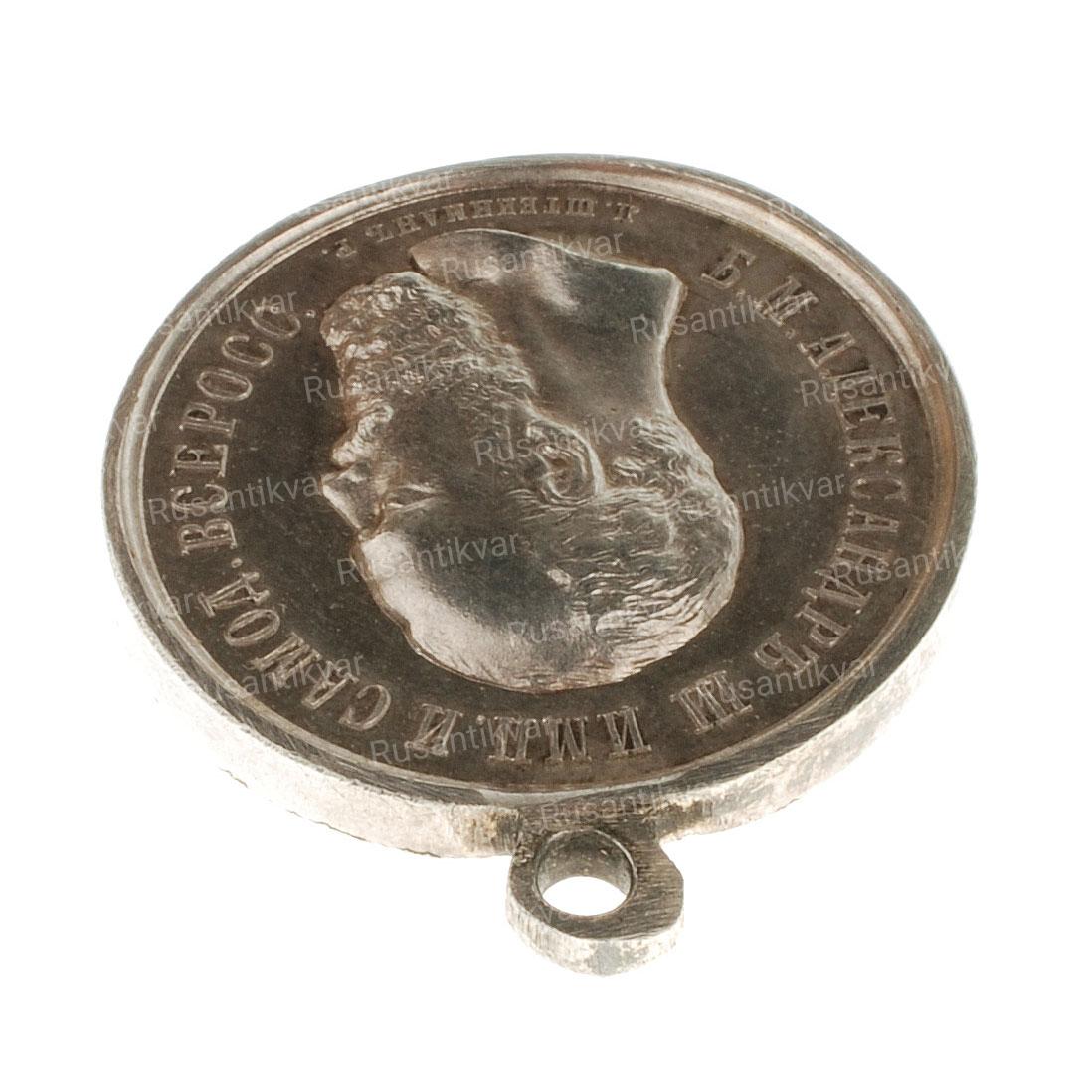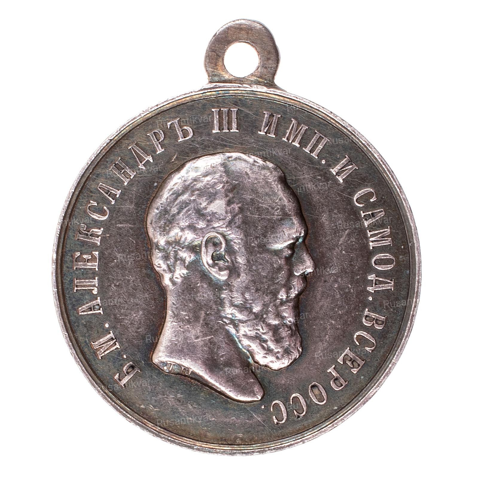 Медаль «За спасение погибавших» с портретом Императора Александра III с инициалами медальера "Л.Ш." в обрезе портрета.