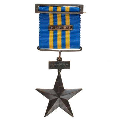 Пятиконечная черненая Бронзовая звезда с подвесной планкой с пятиконечными звездами сверху и петлей для крепленич ленты;Эта награда была учреждена 11 сентября 1973 года ,награждение предусматривалось для всех участников в трех классах. Для нижних чинов, офицеров и старших офицеров соответственно.Награда различапась цветом ленты для каждого рода войск.Красный для армии, светло-синий для Военно-Воздушных Сил, темно-синий для Военно-Морского Флота и зеленый для карабинеров .