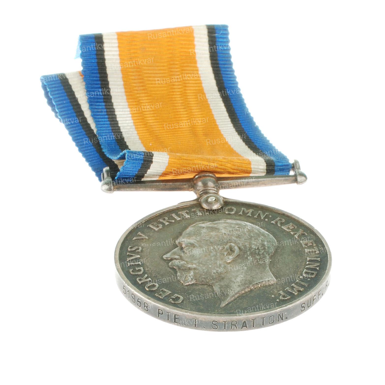 Военная британская медаль (английский язык; British War Medal) «За участие в войне 1914-1918 гг.». Великобритания. Британская империя. Медаль учреждена 26 июля 1919 года, королем Великобритании Георгом V (1910 – 1936 гг.). Награждались британские военнослужащие за участие в I Мировой войне (28 июля 1914 – 11 ноября 1918 гг.). Выпуск 1919-1920 гг.
