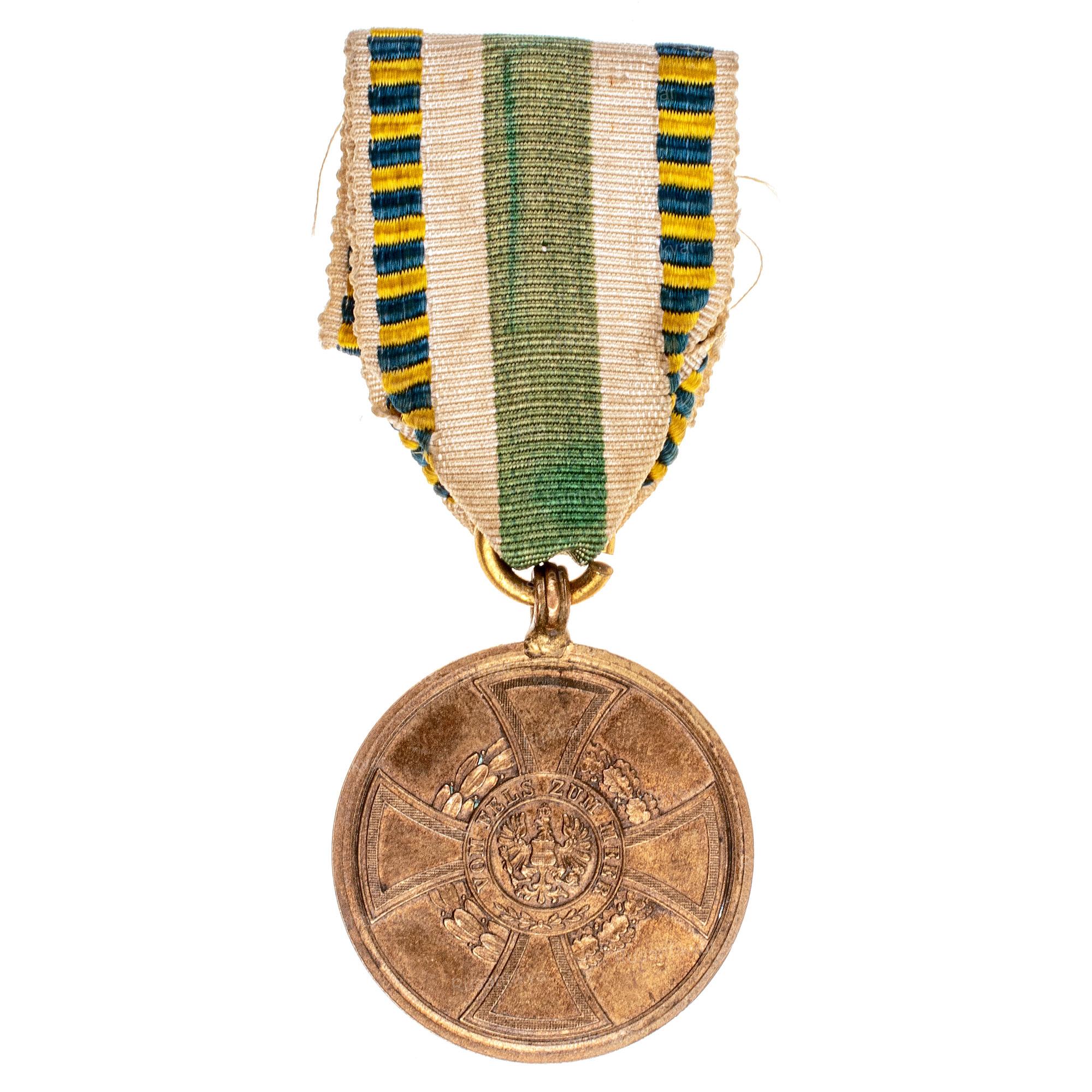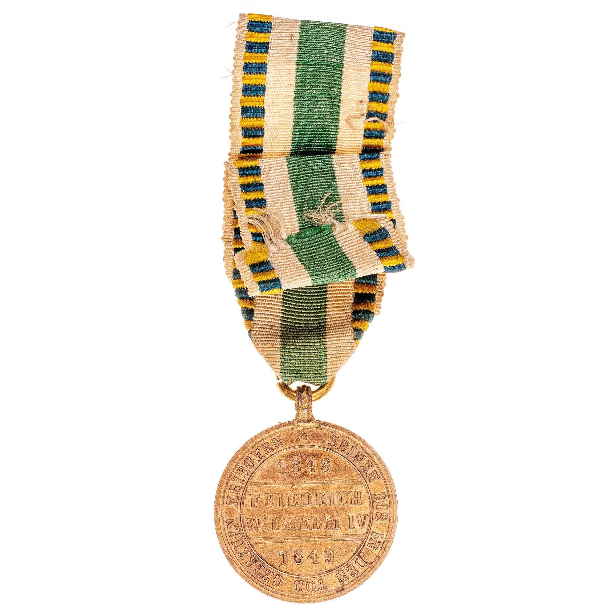 Военная медаль в память подавления революционного восстания в Пруссии, Саксонии и Бадене войсками прусского короля Фридрих Вильгельм IV (1840 — 1861 гг.) 1848-1849 гг. (памятная медаль Гогенцоллернов). Учреждена 23 августа 1851 года. Королевство Пруссия, Германия. Производственный выпуск берлинского монетного двора.