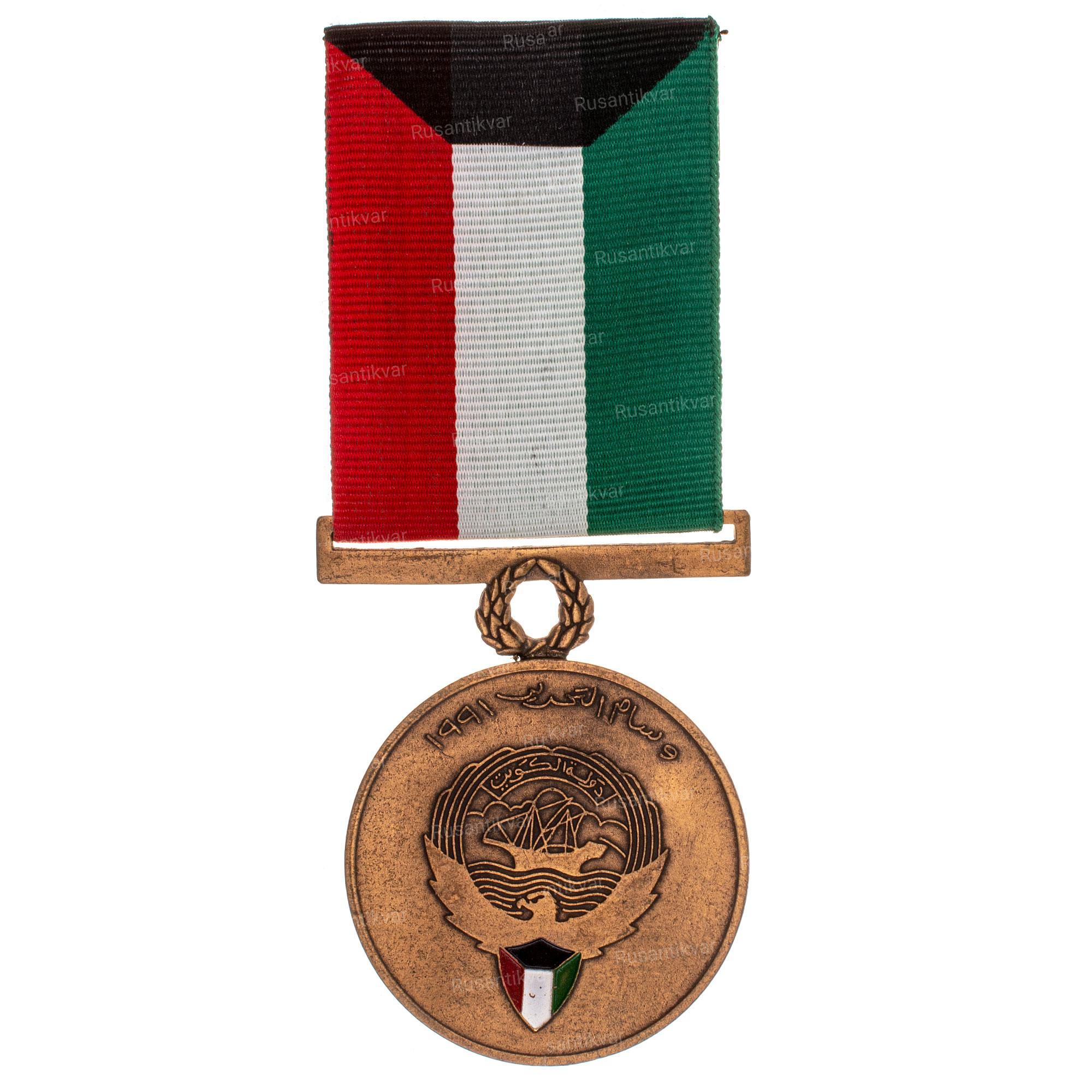 Бронзовая медаль с эмалью, 40 мм в диаметре прикреплена кольцом к пряжке. На лицевой стороне изображён герб Кувейта, состоящий из щита, раскрашенного в цвета флага, на него наложено изображение сокола с расправленными крыльями. Сокол поддерживает диск, на котором изображён парусник, на вершине диска выбито полное название государства. Сверху идёт надпись арабской вязью: 1991 медаль освобождения. На обратной стороне медали изображена карта Кувейта в расходящихся лучах. Ленточка раскрашена в цвета государственного флага Кувейта и содержит три полосы одинаковой ширины в 11,5 мм, каждая окрашена в следующий цвет: англ. Old Glory Red 67156; англ. White 67101; и англ. Irish Green 67189. Сверху – трапеция чёрного цвета.