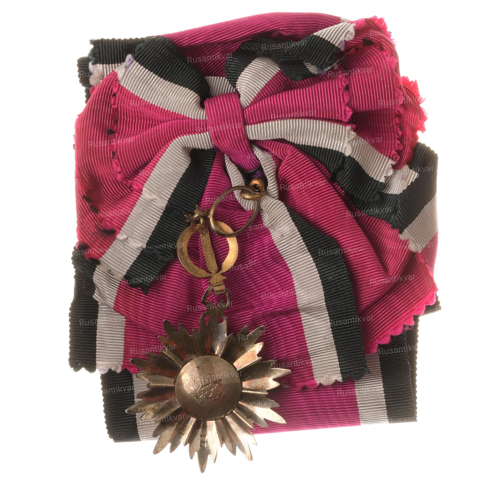 Лента ордена шёлковая муаровая темно-пурпурного цвета с чёрной и белой полосками по краям.