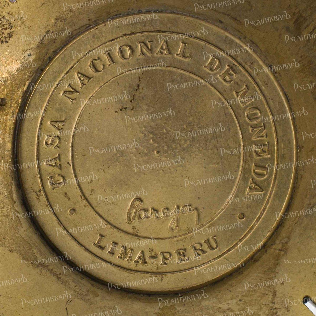 Перу, г Лима, Национальный Монетный двор. На оборотной стороне выбито: "CASA NASIONAL DE MONEDA LIMA-PERU / НАЦИОНАЛЬНЫЙ МОНЕТНЫЙ ДВОР ЛИМЫ-ПЕРУ". Серебро, эмаль, лента, 22.76 гр. Размер 45.73 х 32.81 мм. Сохранность отличная (UNC). Довольно редкий (Р).