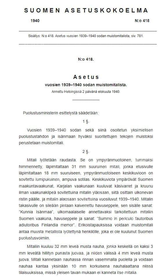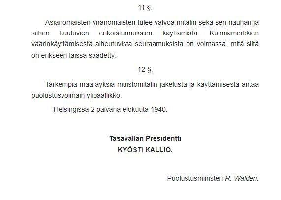 2 августа 1940 года в президентском дворце в Хельсинки президент Кёсти Каллио (Кю́ёсти Ка́ллио (фин. Kyösti Kallio, рожд. Гу́стаф Ка́ллиокангас, фин. Gustaf Kalliokangas; 10 апреля 1873, Юливиеска, Великое княжество Финляндское — 19 декабря 1940, Хельсинки, Финляндия) — финский политический деятель, премьер-министр Финляндии в 1922—1924, 1925—1926, 1929—1930, 1936—1937; в 1937—1940 президент Финляндии) подписал документ, который привез с собой министр обороны Рудольф Вальден (Карл Рудольф Вальден (1878, Гельсингфорс —1946) — финский военный и государственный деятель, генерал. Военный министр Финляндии (1918—1919 и 1940—1944). Член правительства Финляндии. Главнокомандующий финской армией и Гражданской гвардией (1918)). Документ со скучным названием "Свод правил Финляндии 1940 года" под номером 418 станет свидетельством о рождении медали "За боевые заслуги" образца 1939-1940 годов. Первые медали были вручены в сентябре того же года, а с тех пор по 1992 год было награждено более 700 000 медалей всех модификаций.