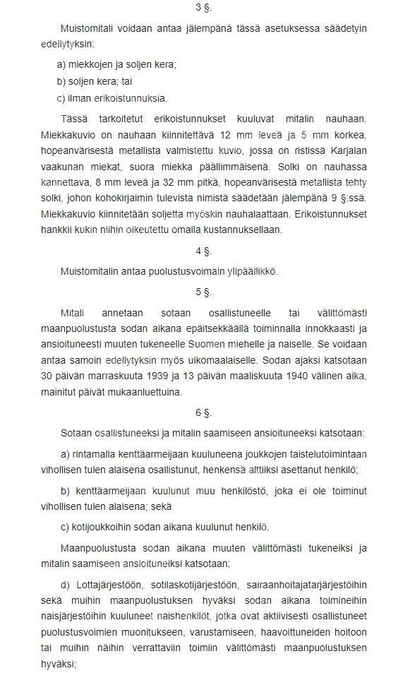 Документ состоял из 12 статей, в которых перечислялось несколько критериев и положений, касающихся его выпуска. Первая из них гласила, что медаль "Учреждена в ознаменование войны 1939-1940 годов, единодушной воли к ее защите и подвигов, совершенных на благо Родины". Другие статьи рассказывали о том, как должны были выдаваться дополнения к медали. В целом медаль очень либерально вручалась всем, кто в той или иной форме занимался военным делом, от тех, кто готовил и пек в столовых для солдат по всей стране, до юношей и девушек, которые помогали передавать сообщения и стирали обмундирование. Одна из наиболее интересных заметок находится в конце статьи 6, которая гласит: "Лицо, которое во время войны сделало себя виновным в действиях, порочащих честь солдата, таких как страх перед войной, побег, уклонение от военной службы или членовредительство, считается недостойным получения памятной медали". К каждой медали прилагалось удостоверение, в котором указывалось полное имя награжденного, дата и место его рождения, а также к награде могли вручаться пристежки (в виде перекрещенных меча и сабли — за участие в боевых действиях) и планки с идентификации географического расположения мест сражений. Каждое удостоверение подписывалось Главнокомандующим Силами обороны.