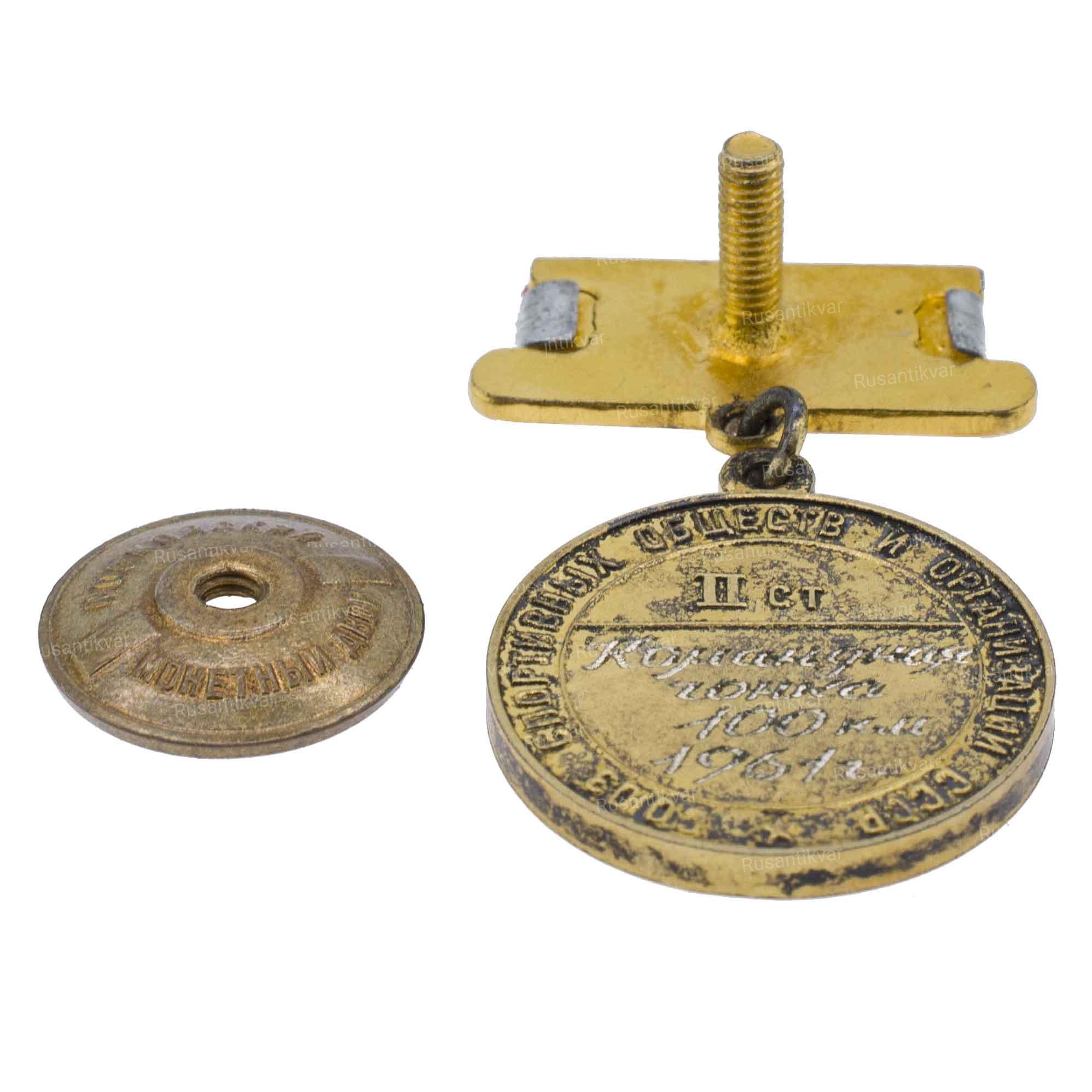 ММД, 1961 г. Серебро, позолота, шелк (муар); 12,04 г. Диаметр 18 мм. На гайке надпись по окружности: «МОНЕТНЫЙ / ДВОР». На об. ст. выгравировано: «Командная / гонка / 100 км/1961г.». Сохранность отличная. Редкая.