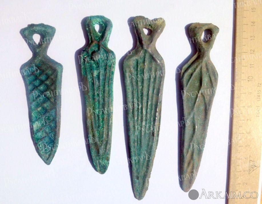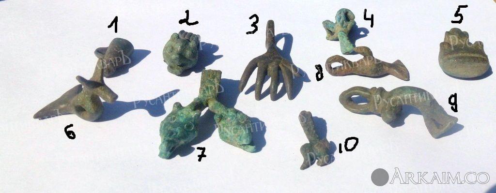 Разнообразные амулеты кобанской культуры в виде животных и предметов.