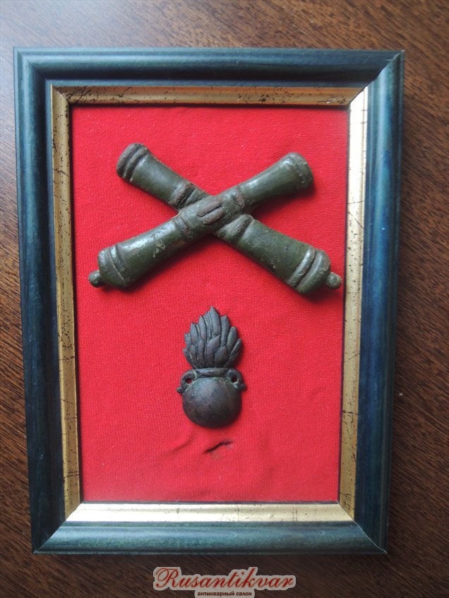 Паша, в узаконении написано: 08.10.1808 на кивера нижнихъ строевыхъ чиновъ Пешей Артиллерiи вместо банта данъ гербъ, изъ двухъ медныхъ, на-крестъ-положенныхъ пушекъ, съ медною же бомбочкою.