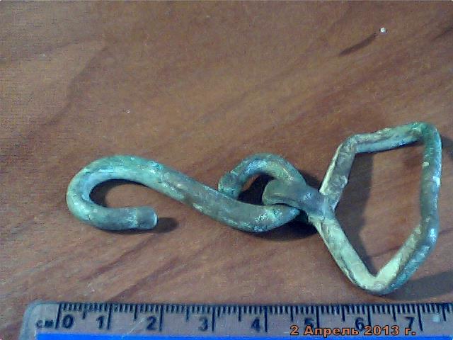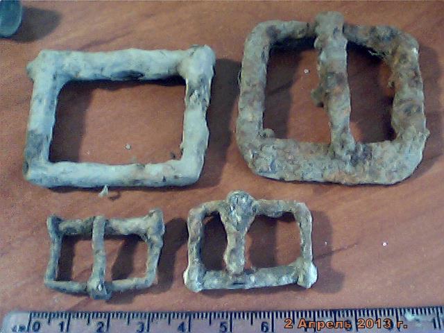 6-я характерные французские пряжки со вставным крутящимся роликом для уменьшения истирания скользящего ремня и одна здоровая, похоже русская, пряга от конской упряжи.Куда шли такие францы я не в курсе.