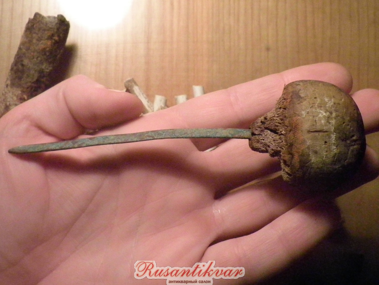 Попалось латунное шило с деревянной "пробковой" ручкой . То ли шило , то ли сети вязать.