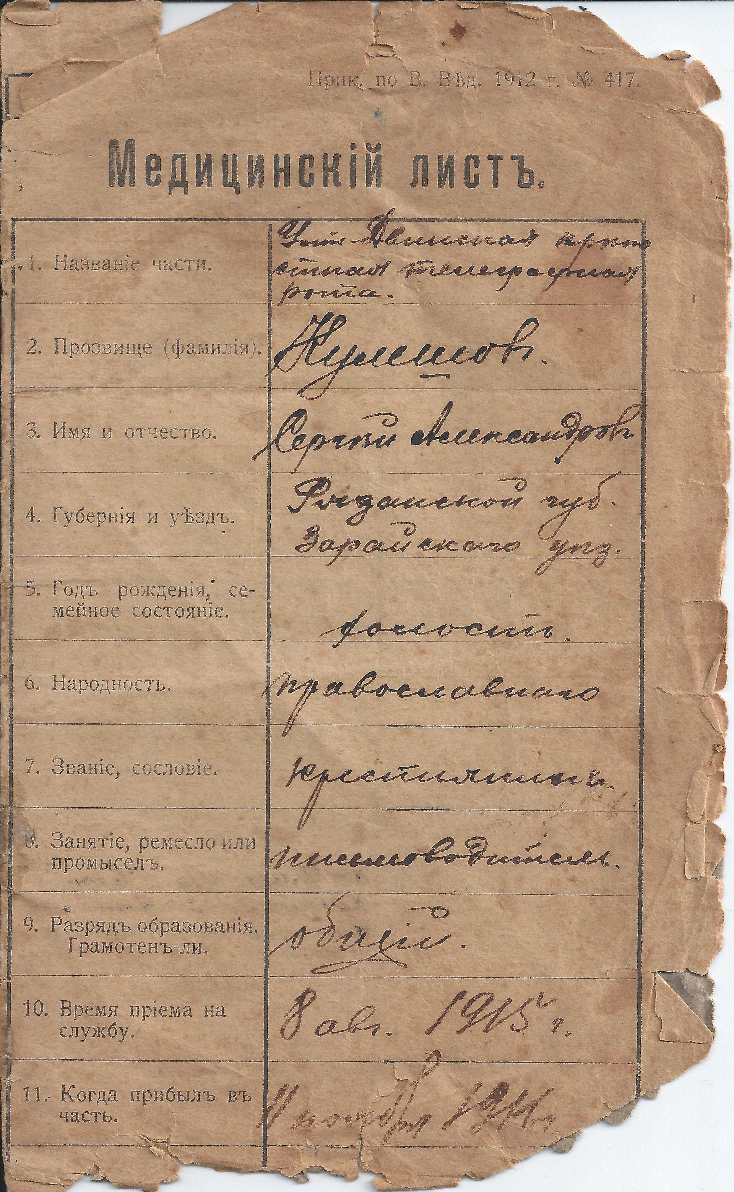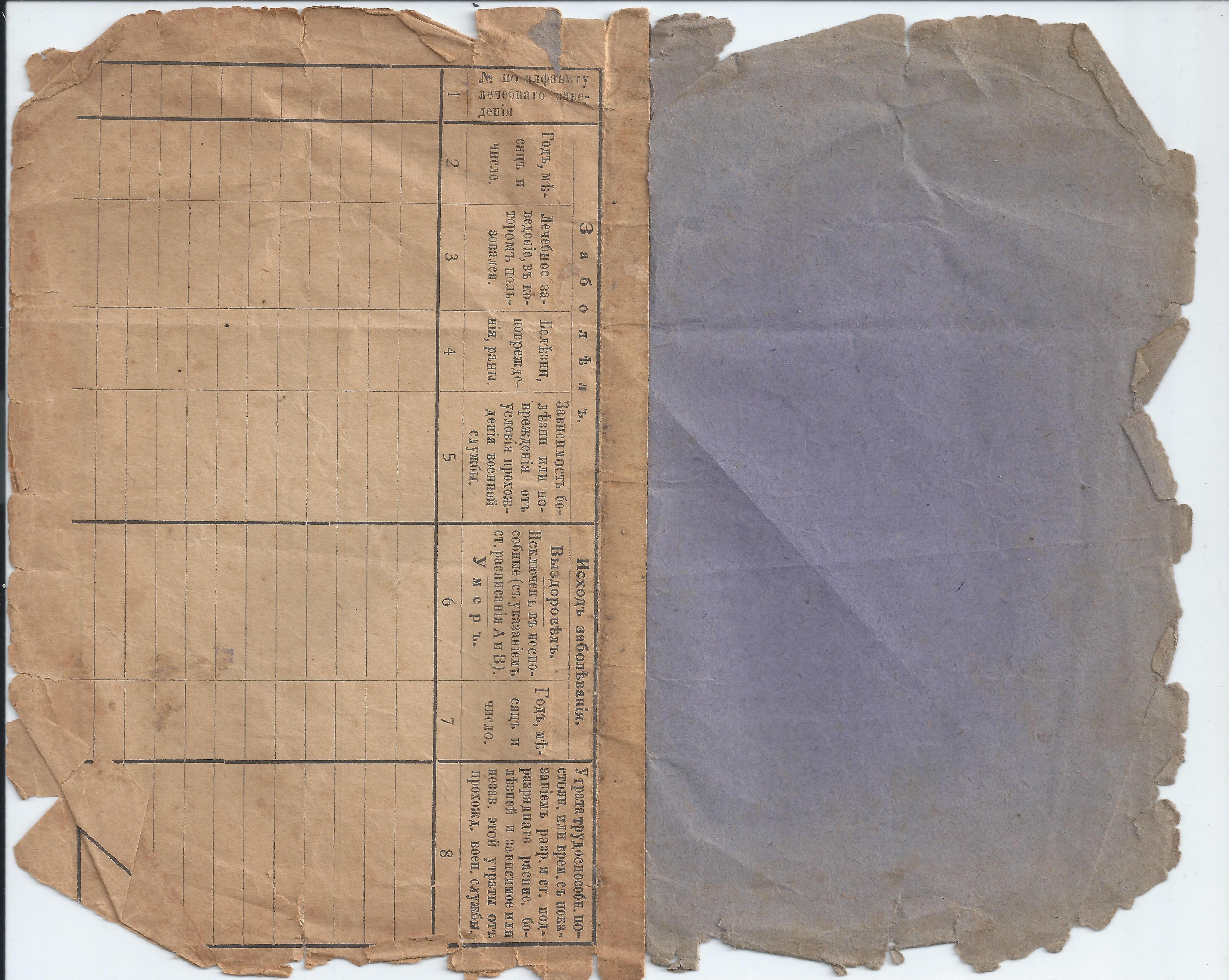 Хочу показать один из документов семейного архива-медицинский лист времён ПМВ (принадлежавший моему прадеду):