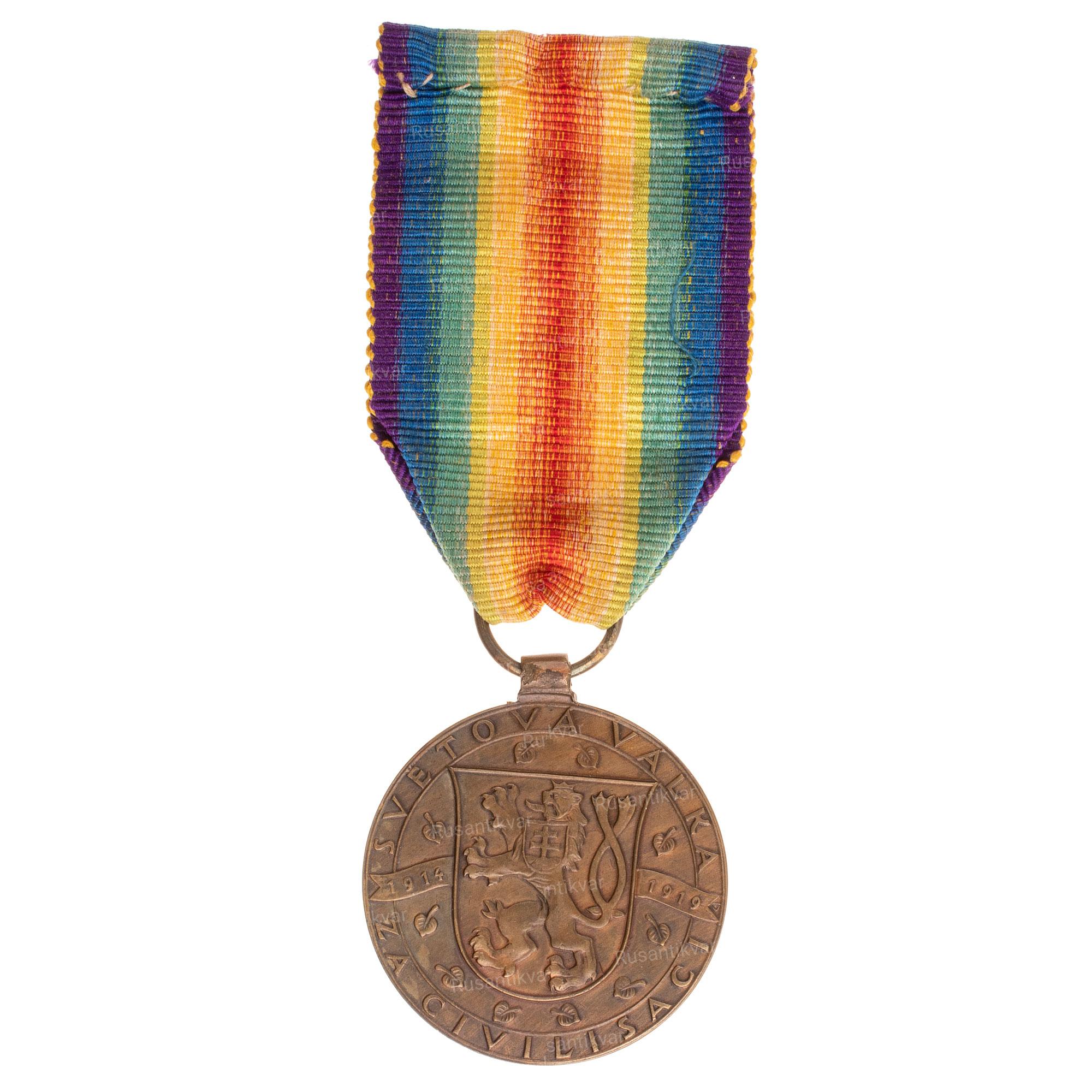 По предложению французского Маршала Фоша (возглавлял на Западном фронте все силы союзников, годы жизни 1851 - 1929 гг ), страны Антанты решили в честь победы выпустить специальную медаль для всех принимавших участие в военных действиях военнослужащих и гражданских лиц. На аверсе должно быть помещено изображение крылатой богини Победы, а на оборотной стороне надпись "Великая война во имя защиты цивилизации". Медали должны быть выполнены из бронзы, диаметром 36 мм и иметь ленту цветов радуги. Официально медаль выпустили 14 государств: Бельгия (350 тыс), Бразилия (2.5 тыс), Великобритания (6 млн), Греция (50 тыс), Италия (2 млн), Куба (7 тыс), Португалия (100 тыс), Румыния (300 тыс), Сиам (Тайланд) (1.5 тыс), США (2.5 млн), Франция (2 млн), Чехословакия (90 тыс), Южная Африка (75 тыс) и Япония (700 тыс). На оборотной стороне, кроме согласованной надписи, многие страны поместили собственную символику, символику остальных стран - победительниц или их перечень.
