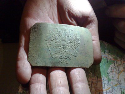 Наш товарищ отличился два дня подряд-вчера умудрился найти на пустом месте австрийского орла с шако(очень редкая птица),а сегодня три пряги-два артиллериста и РИА с травленным гербом, обратная сторона гладкая(возможно кто подскажет по пряге?).У другого товарища такая же необычная пряга,так что мало но все не стандартно А нам бедным нечего показать кроме гаубичной гильзы и гранат(фото не делали,тяжело кулек распаковывать