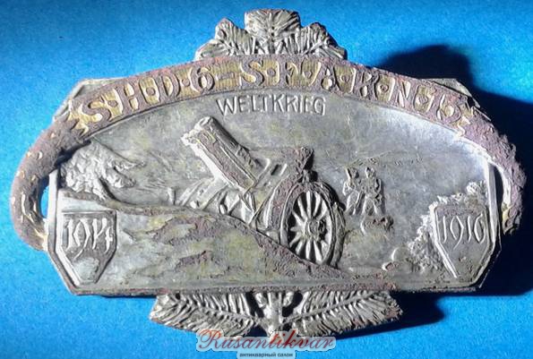 Покопался в литературе......сразу могу сказать, что это не Германия, а Австро-Венгрия......Быстрее всего(на 100% не уверен, но на 90% точно....), этот памятный знак(именно памятный, а не наградной) принадлежит к частям горной артиллерии Общей Армии Австро-Венгрии....не Ландвера. Интересно, что на нем изображена 150 мм тяжелая пушка, которая в горной артиллерии применялась мало... :? , так как в основном артиллерийские подразделения, которые предназначались для ведения боевых действий в горной местности, вооружались пушками с уменьшенной ходовой частью, чтобы их легче было транспортировать на мулах, как правило это 70 и 75 мм легкие орудия.... :?