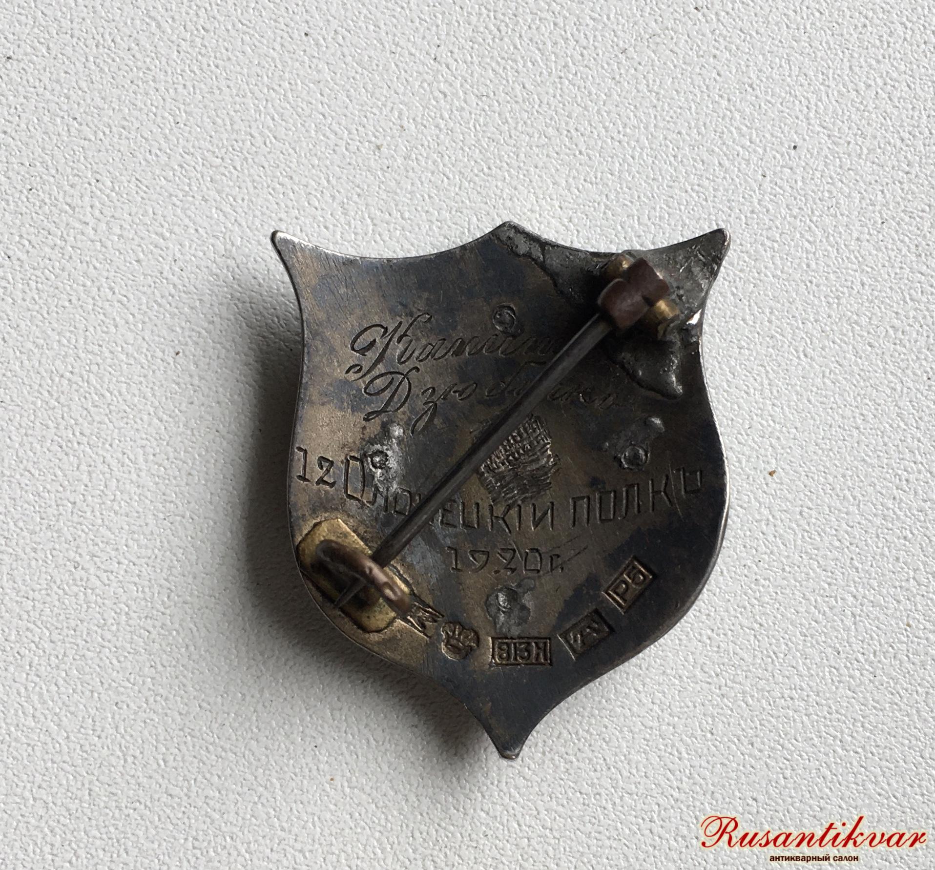 Знак 12-го Северного стрелкового Олонецкого полка. Финляндия, Або (Турку), 1920 г. Фирма «Kultateollisuus Ky». Клейма на об. ст. знака внизу: клеймо фирмы [крылатый молоток], клеймо для изделий, выполненных в Финляндии [корона], проба металла «813 H», городское клеймо Або (Турку) [древняя буква «А»] и годовое клеймо «P5» (1920 г.). Серебро, позолота, эмаль, 8,03 г. Размеры 27,2×22,8 мм. Оригинальное винтовое крепление переделано на булавку с застежкой. Принадлежал В.Н.Дзюбенко. Гравировка на об. ст. знака в четыре строки: «Капитанъ / Дзюбенко / 12 Олонецкiй полкъ / 1920 г.».Знак выставлялся 2018 году на аукционе"Монеты и Медали".В литературе по знакам "Белого движения" знак не описан.