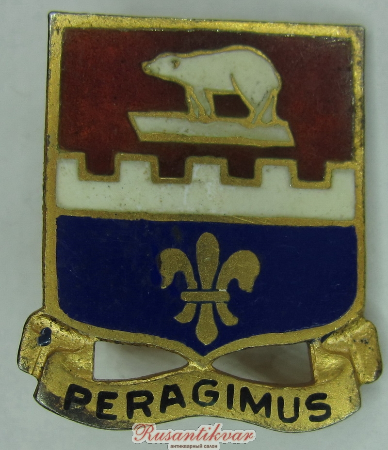 Не смотря на то, что право именоваться "Полярными медведями" американские военные получил еще во время своего пребывания в России, полковой знак появился несколько позже. Первыми отличилась пехота. В период сборов в августе 1924 г. в лагере Кастер офицеры полка, участвовавшие в "миссии по освобождению Русского Севера от большевиков" учредили в честь пятилетия тех событий полковой знак, на котором были изображены птички (отсылка к Детройту, из которого была призвана основная часть резервистов 339-го), белый медведь (как память о зиме в Приполярье) и надпись кириллицей "Штык решает" (в чем пришлось убедиться этим парням на нашей земле). Причем, что забавно - надпись была сделана изначально не совсем правильно по-русски (и на первых знаках это хорошо видно).