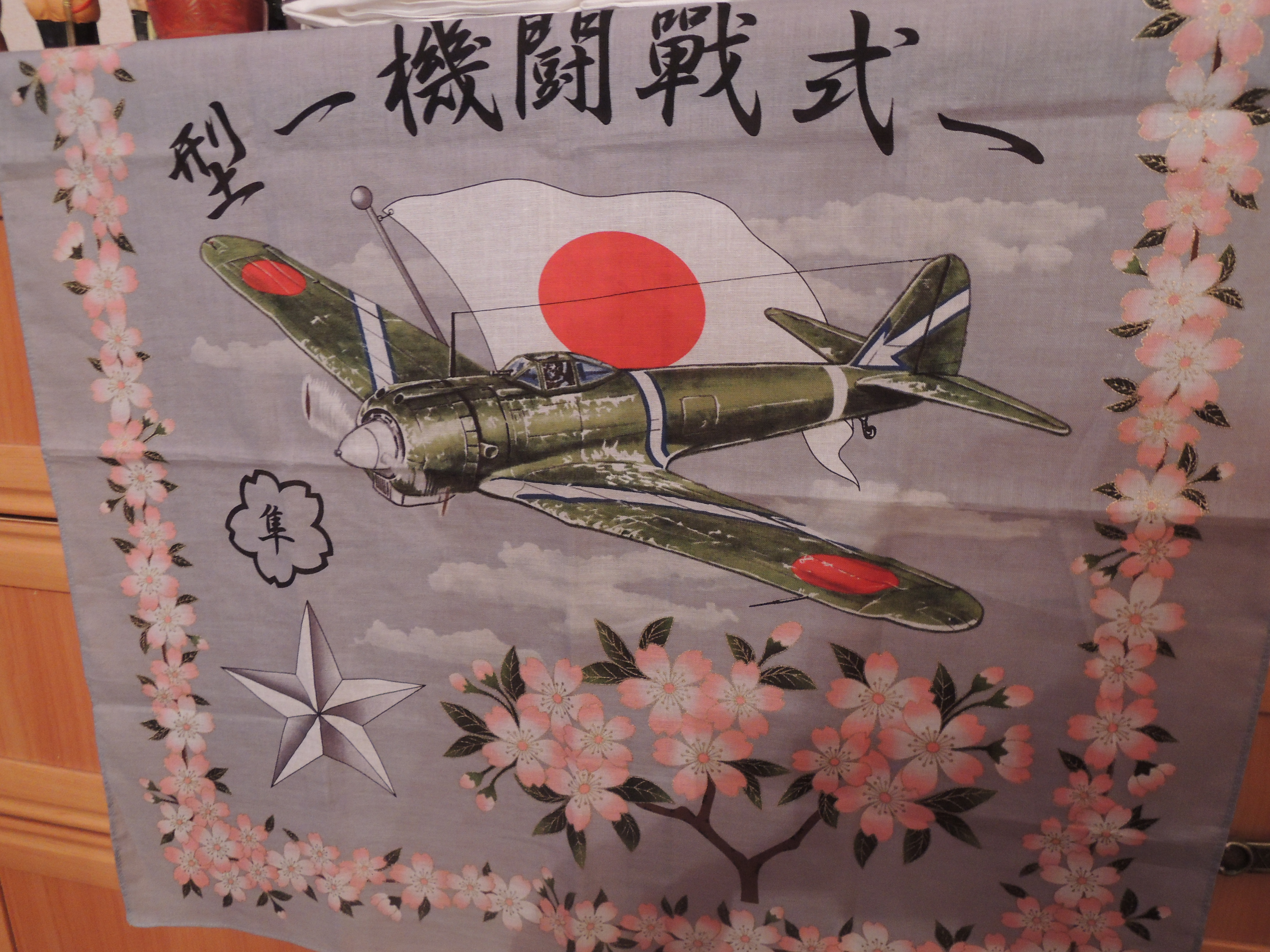 Памятный платок для летчиков камикадзе с изображением самолета Зеро и цветков Сакуры.