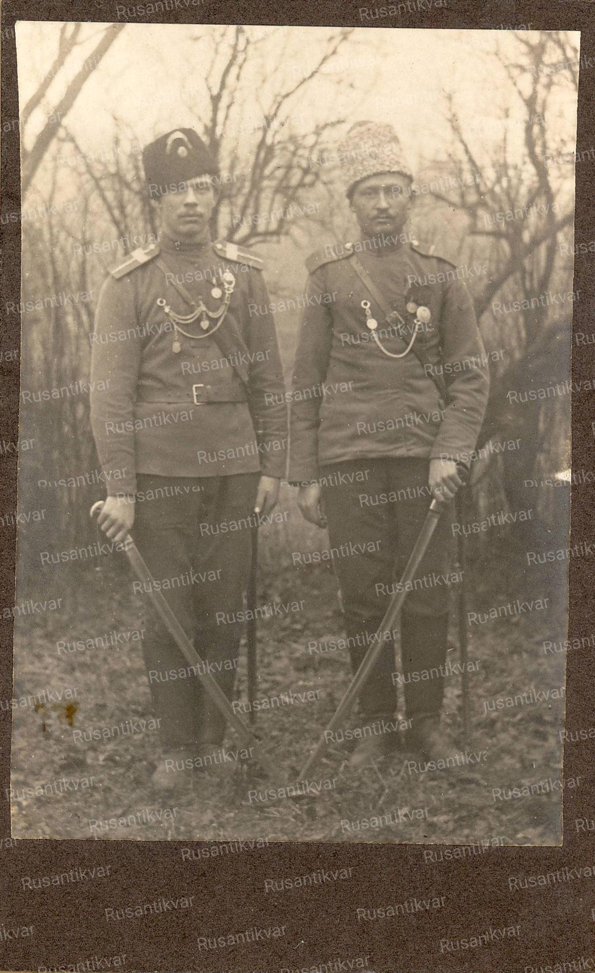 У одного из офицеров на груди орден Св.Станислава 3 степ.без мечей ( два нижних орла на ордене отсутствуют).Медаль "В память Русско-Турецкой войны 1877-1878 гг". и медаль "В память царствования Императора Александра 3".Один офицер награжден орденом Св.Георгия 4 степ.,у полковника в центре Знак отличия ордена Св.Георгия 3 степ.с бантом.
