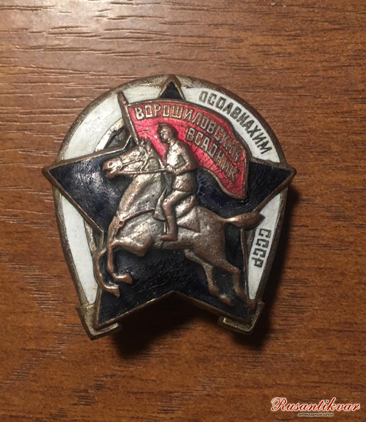 Знак "Ворошиловский всадник" тип 1.1936-39 гг.Учрежден 2 июня 1936 года и вручался членам общества,успешно выполнившим нормативы по конно-спортивной подготовке в кавалерийских кружках ОСОАВИАХИМ.